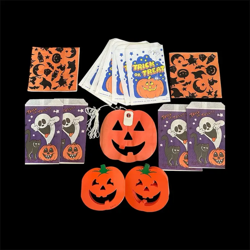 Included everything shown!! 2 pumpkin garlands 2 old halloween napkins SEVERAL vintage trick or treat bags