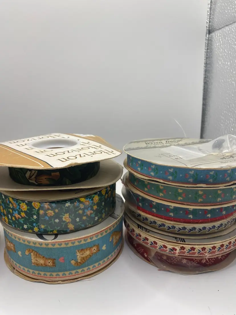 Some new some used lot of vintage ribbons. 17 rolls total. Varied widths and lengths.