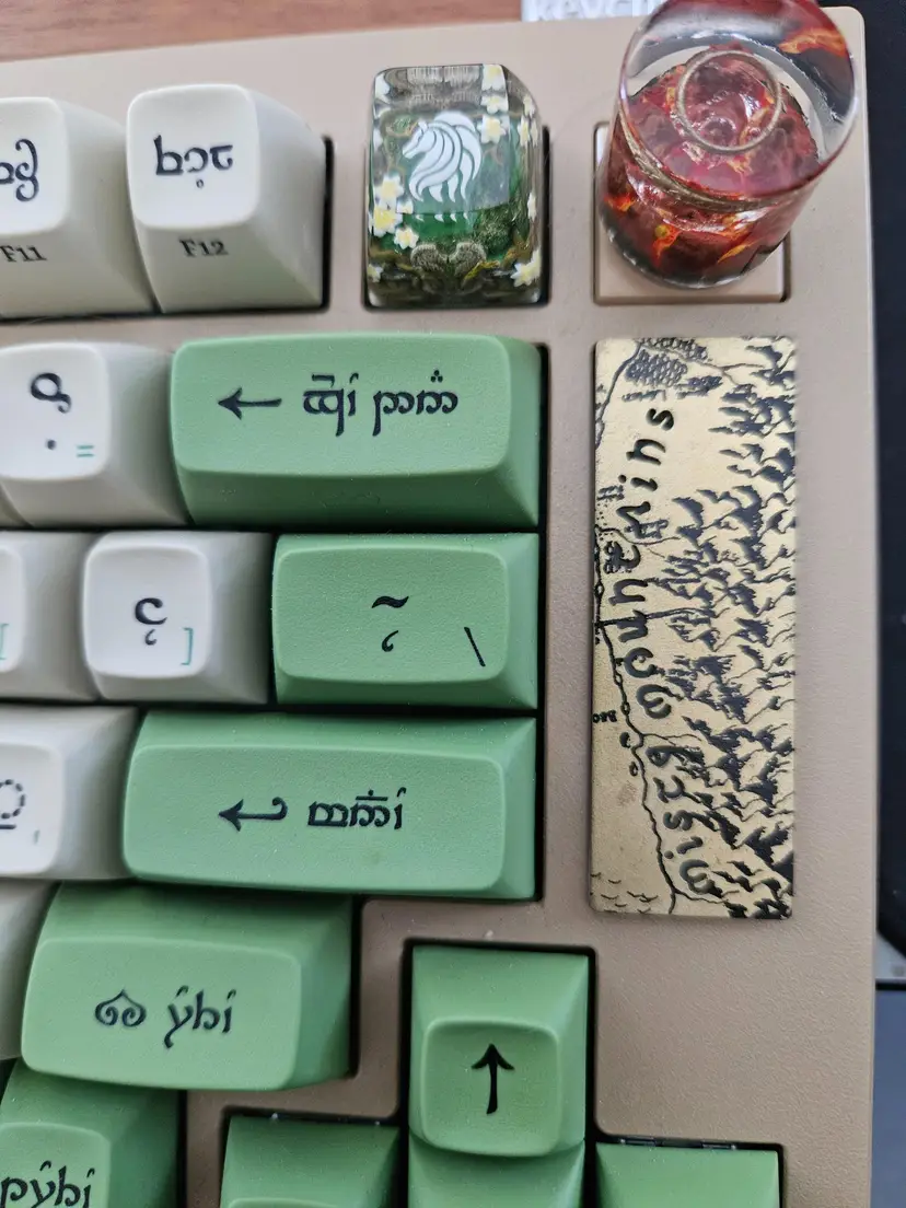 Drop LOTR elven keycaps (with english sublettering), Dwarf factory custom resin keycaps x2 (Rohan and One Ring), AquaKing EverGlide Linear Switches, Custom Brass Plate with accurate LOTR Tolkien Map- Will include a Glorious Coiled Cable (White) and Original Q1 Hardware as well