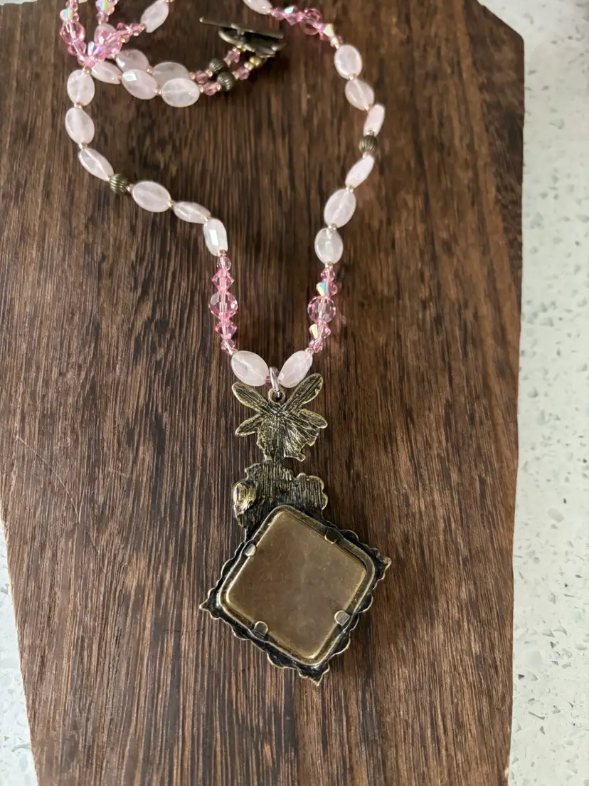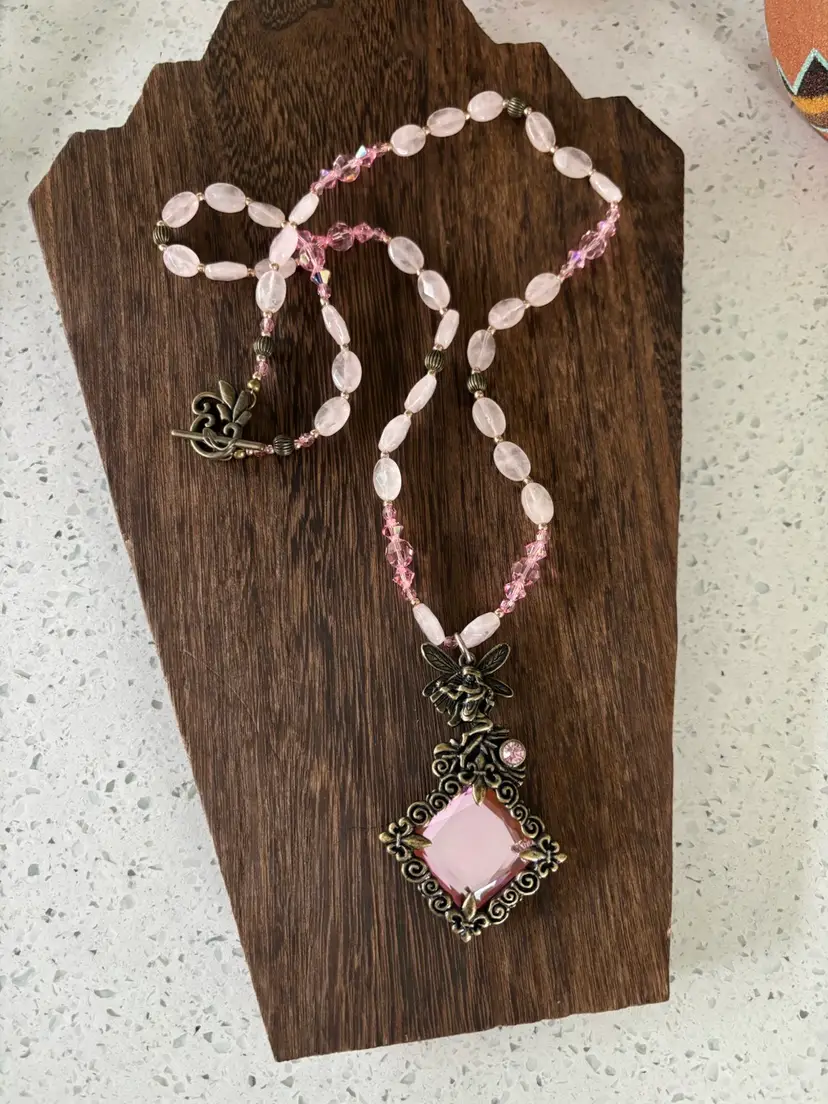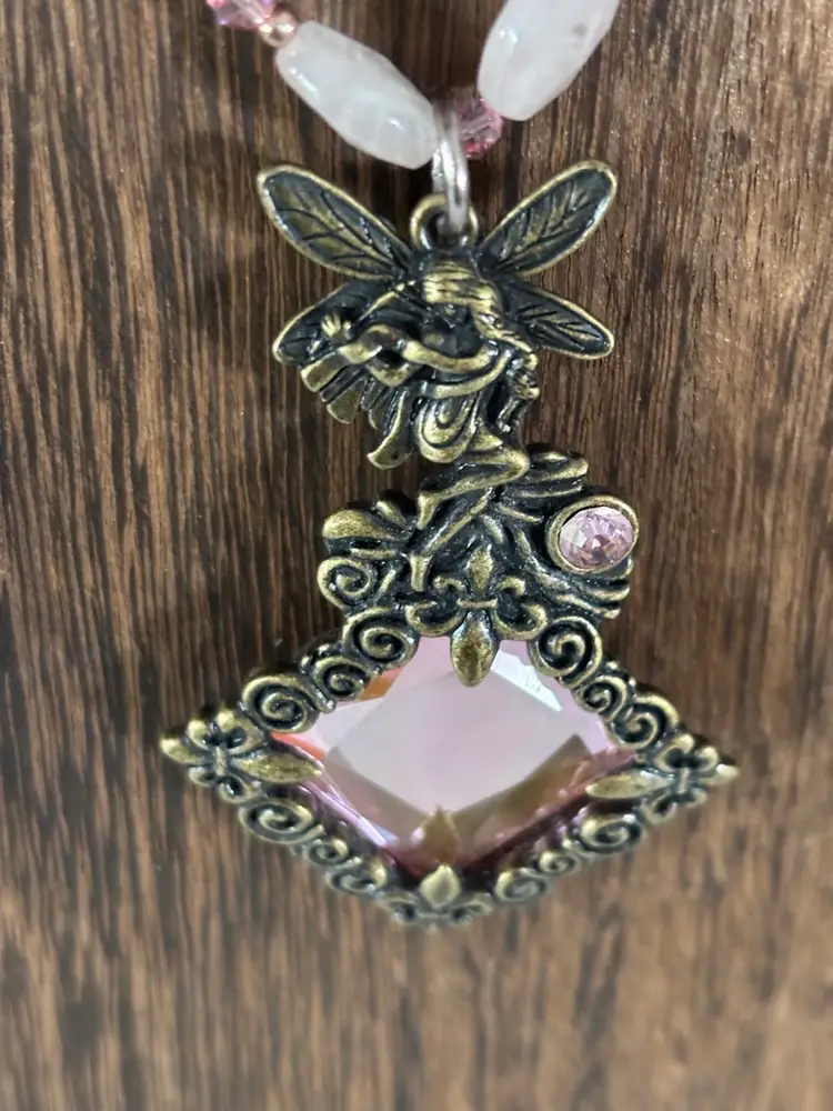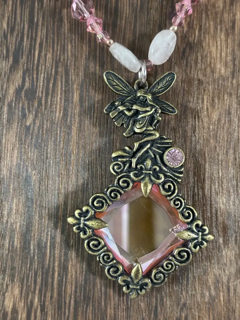 28”long pink vintage beads with brass and gold accents coming down to a beautiful pink mirrored with fairy on top pendant.