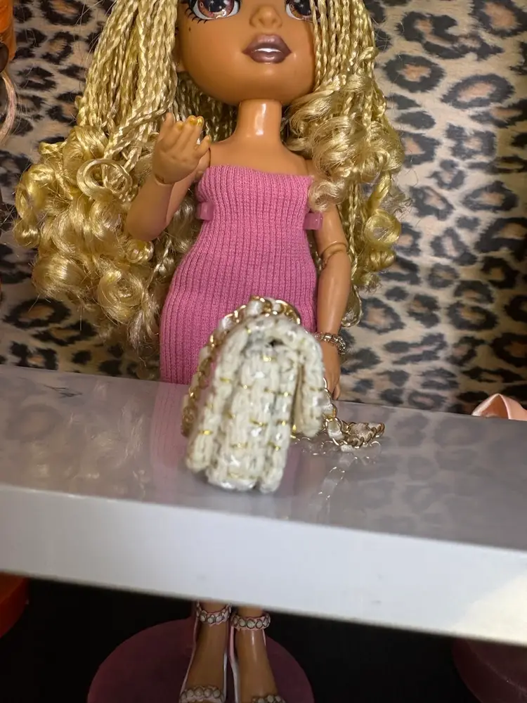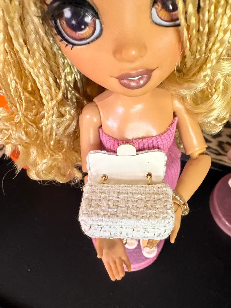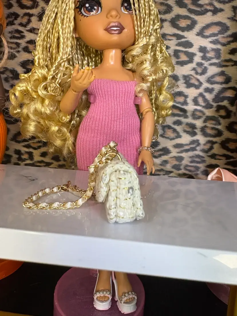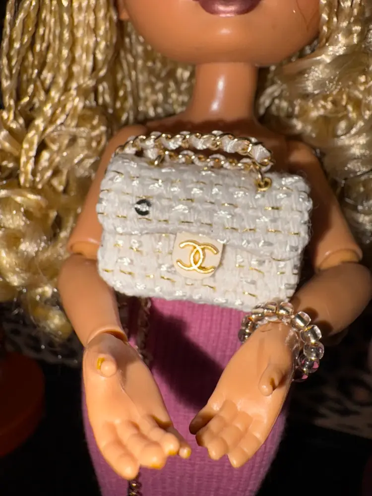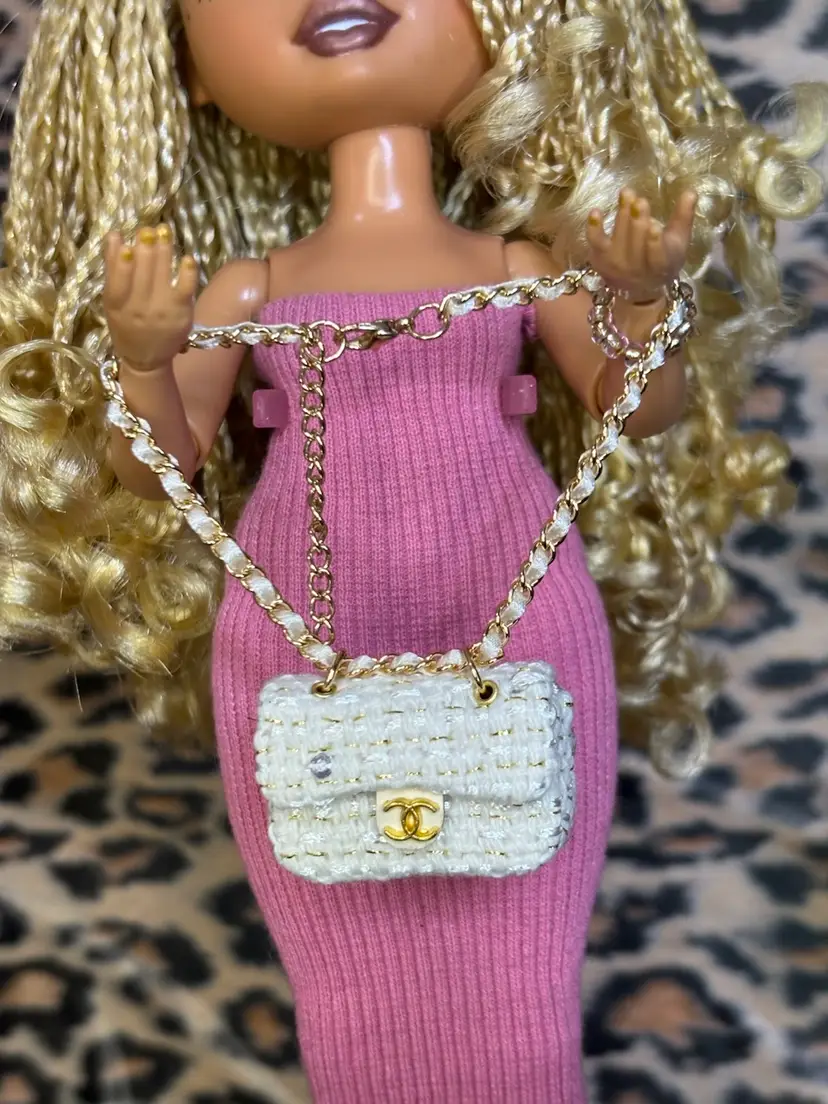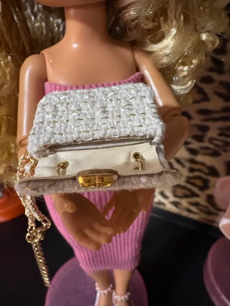 This bag is white with silver sequins and gold accents with gold threading weaved throughout the bag.