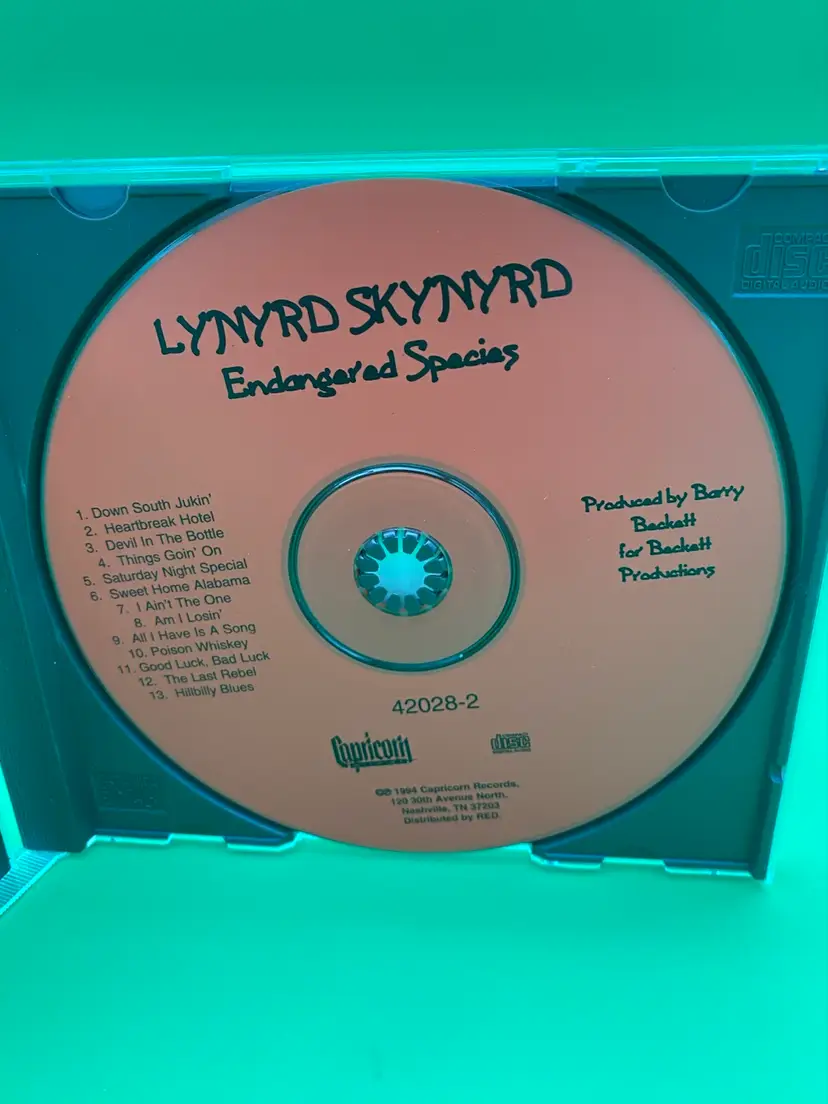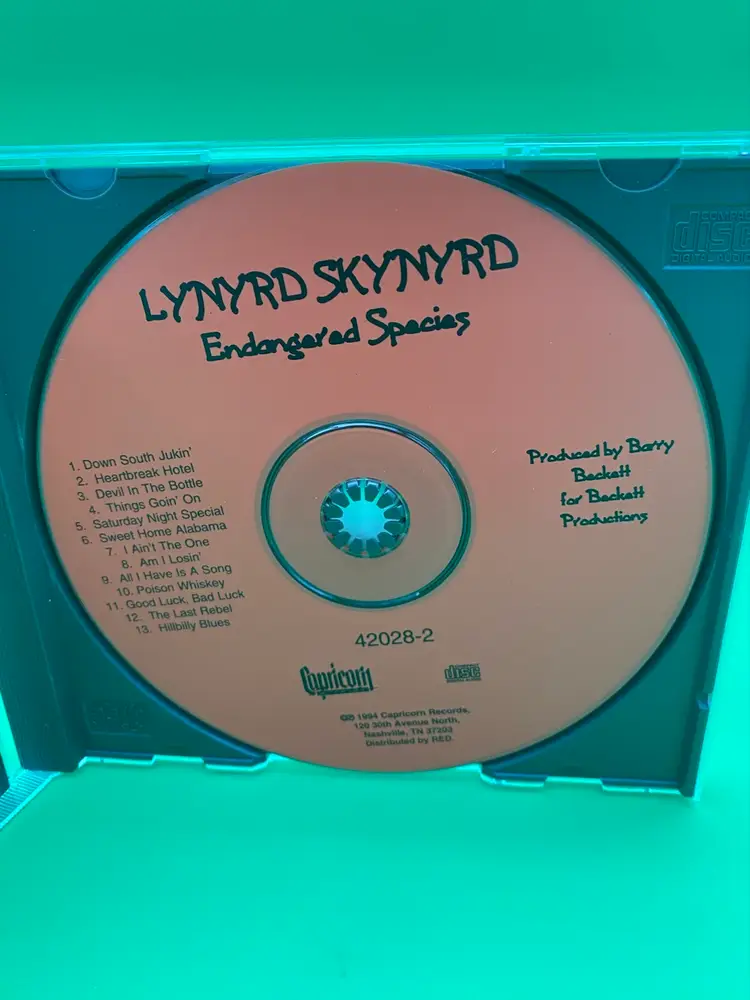 You are purchasing one Endangered Species CD by Lynyrd Skynyrd and Capricorn Records from 1994. This CD is in overall great condition. No cracks or chips on the Case. No stains or rips on the Inlay. Disc is in good condition with minimal signs of wear, tested in great playable condition without issues.