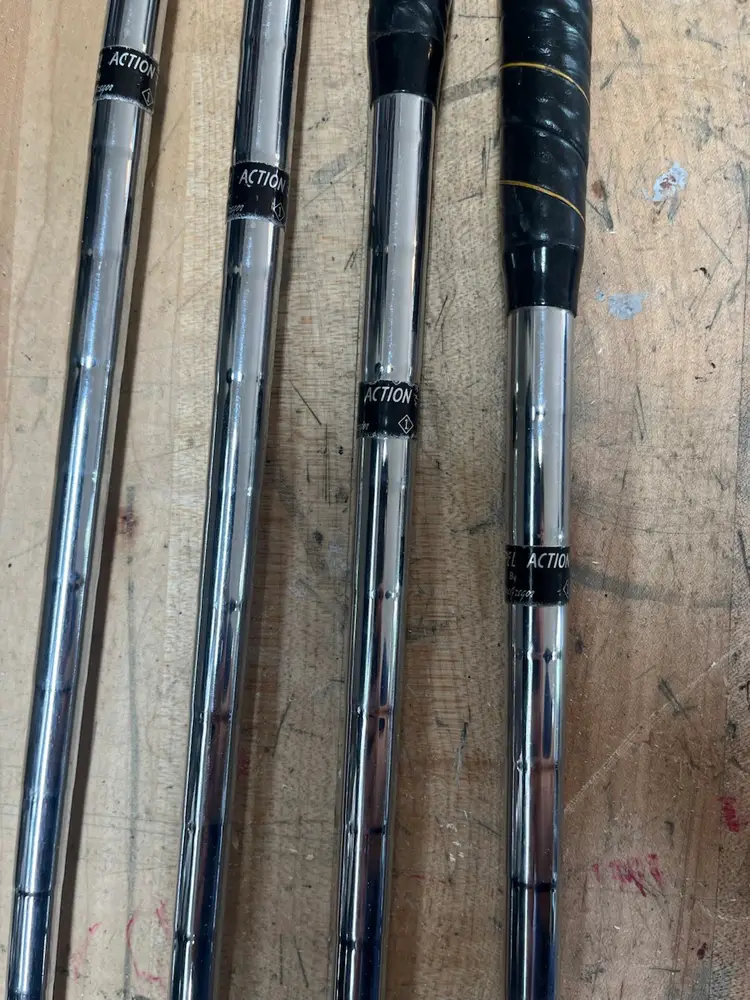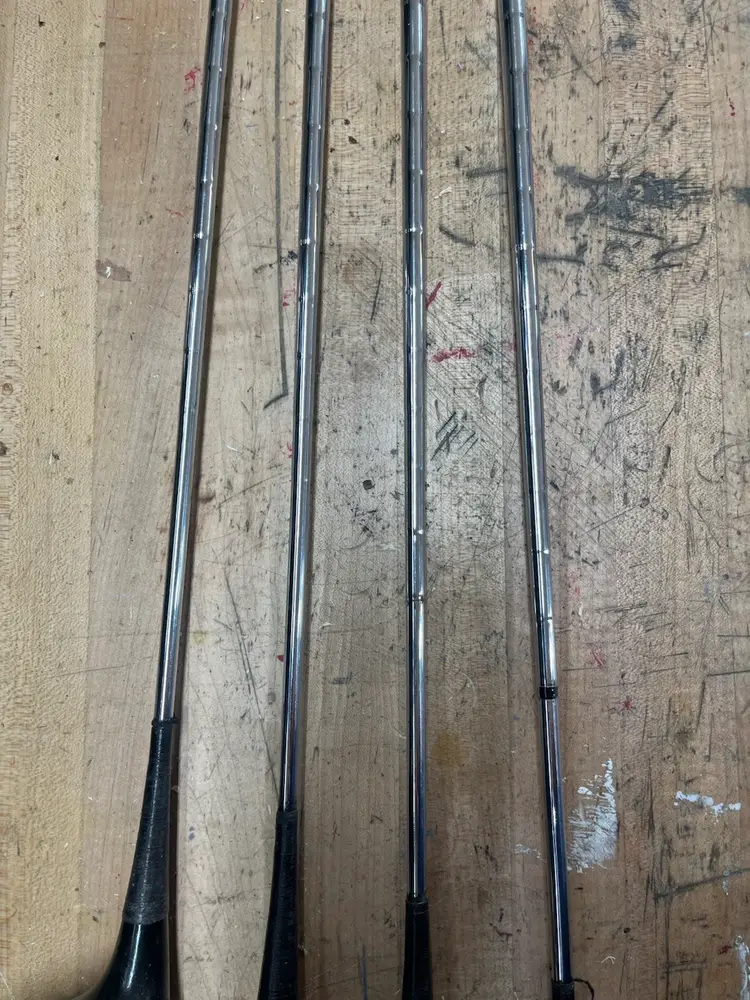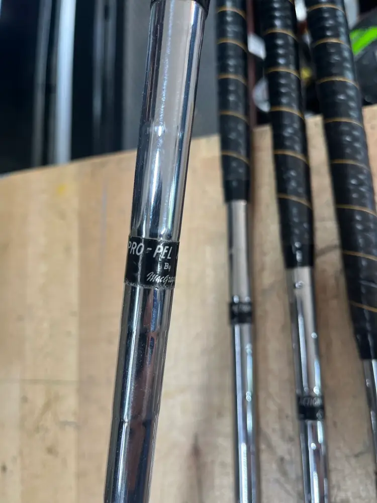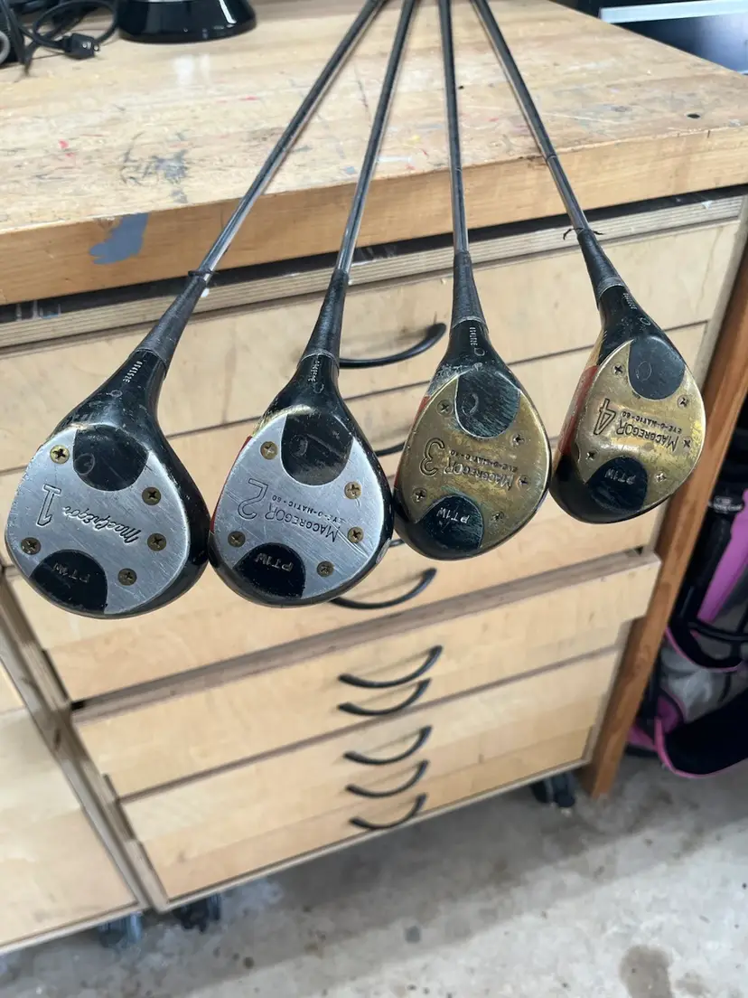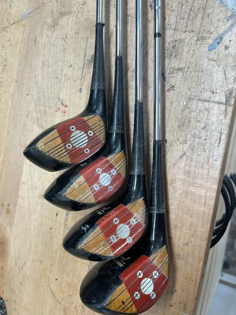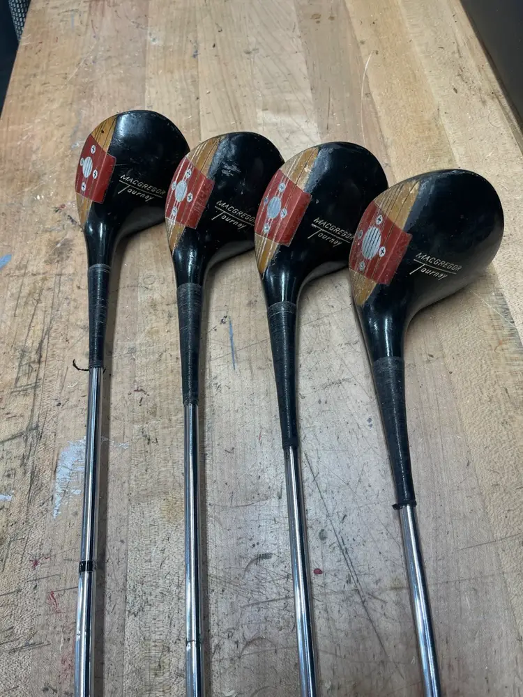 Macgregor tourney woods,looks to be persimmon to me. 1,2,3 and 4 wood eye-o-matic-60.