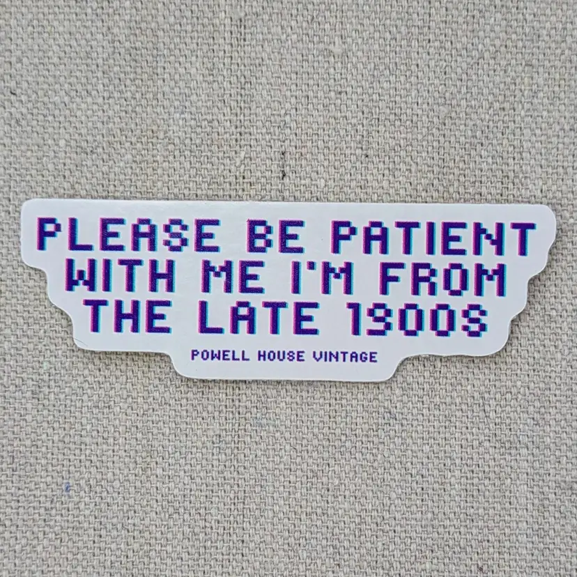 Please Be Patient With Me I'm From the Late 1900s' vinyl sticker designed by me. Perfect for laptops, notebooks, or anywhere.