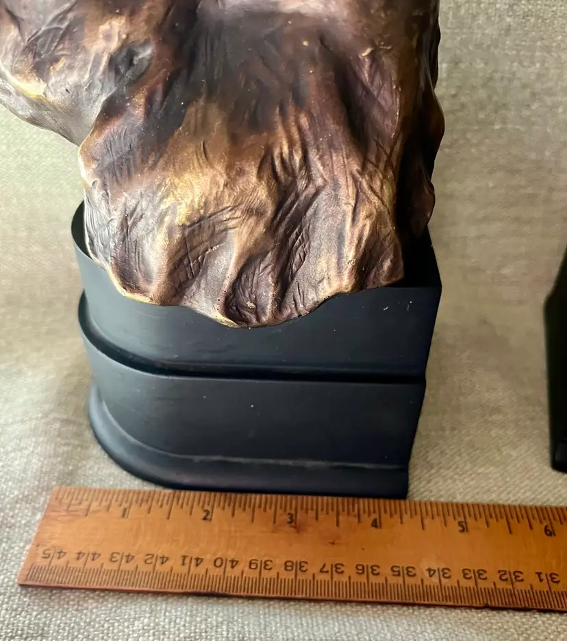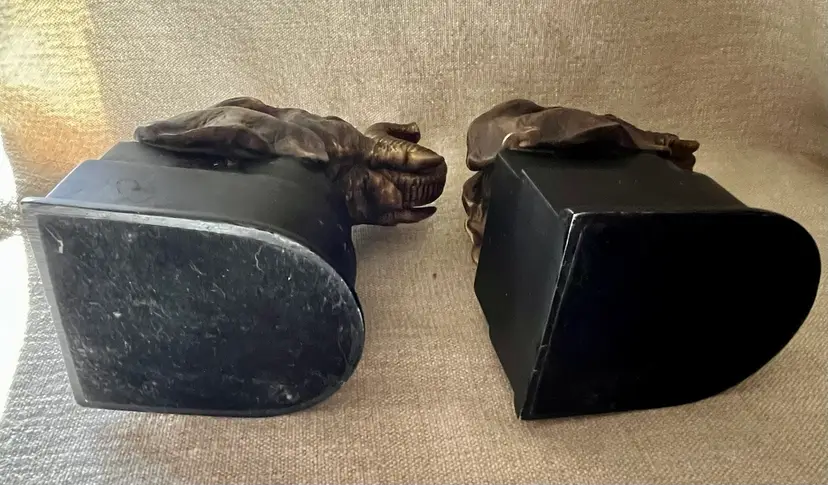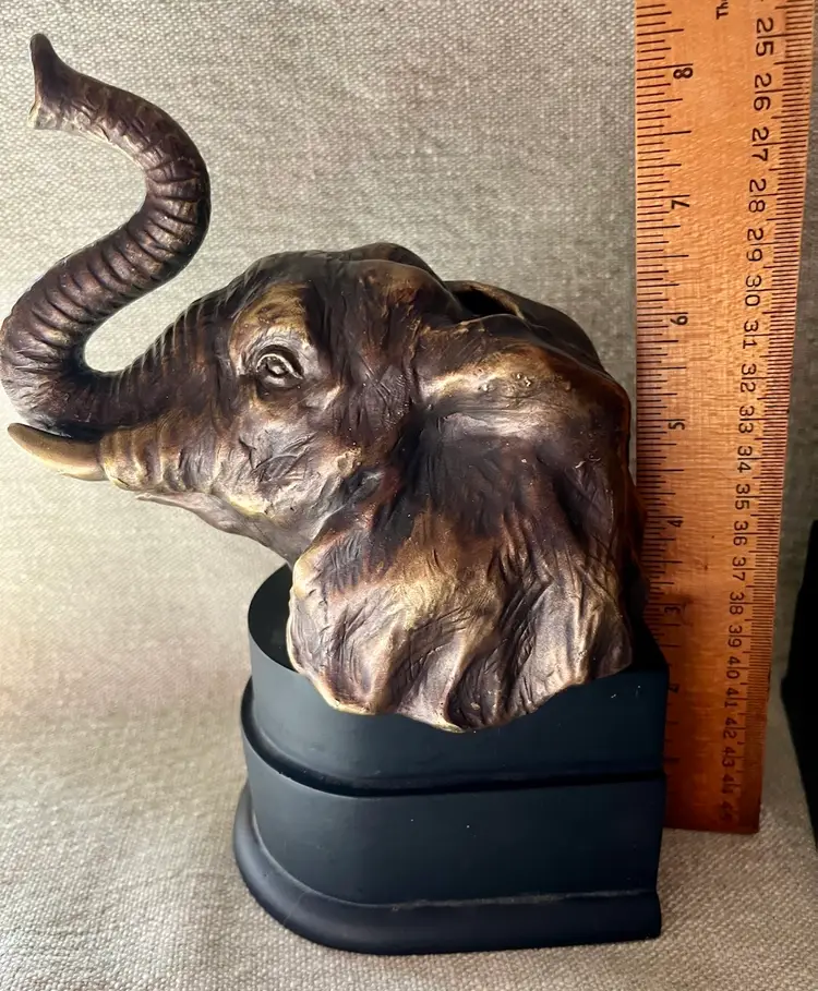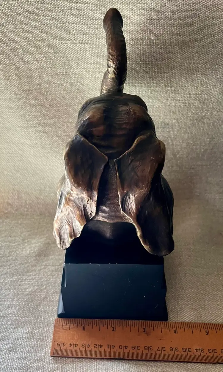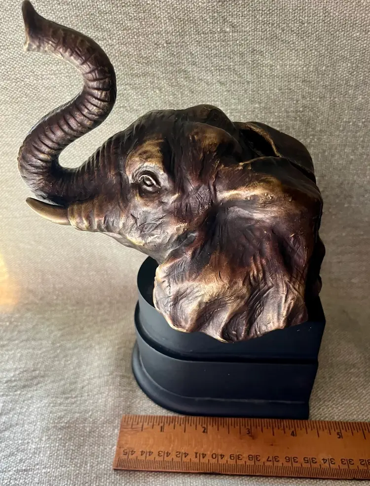 The Majestic Sculptural Adult Elephant Trunk Up Tusks Heavyweight Brass Bookends are a stunning Symbol of Wisdom, Strength, Prosperity, Longevity and even Royalty. Made of metal, with antiqued-brass head and black matte bases, these bookends feature a detailed depiction of an adult elephant head with its trunk up and tusks prominently displayed. The heavyweight (5 pounds each) pieces not only give stability to books you display these are an eye-catching addition to your home or office or a rental vacation.