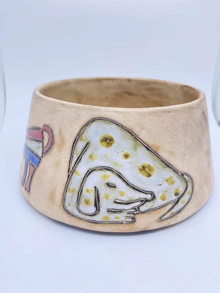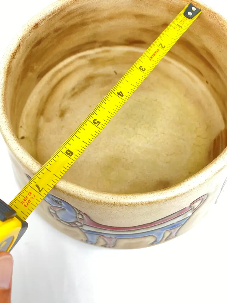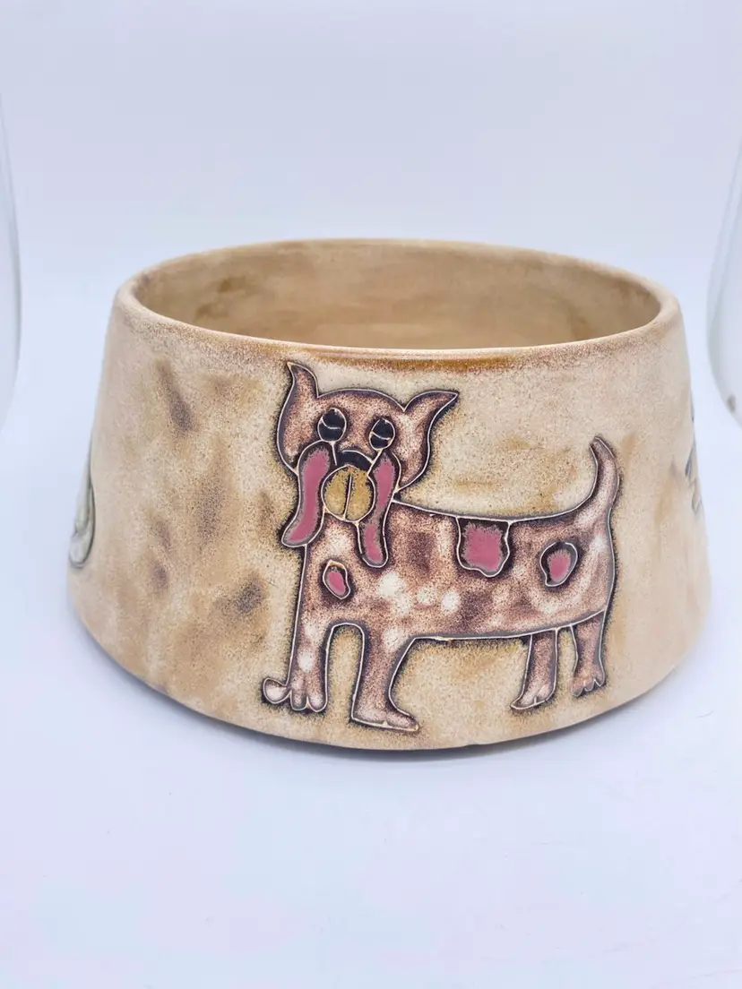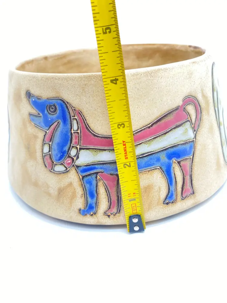 64oz- X-Large dog bowl. Has a weird spot inside the bowl- I don’t think it’s a crack- doesn’t feel like one. Holds water just fine. Marked Mara in the bottom.