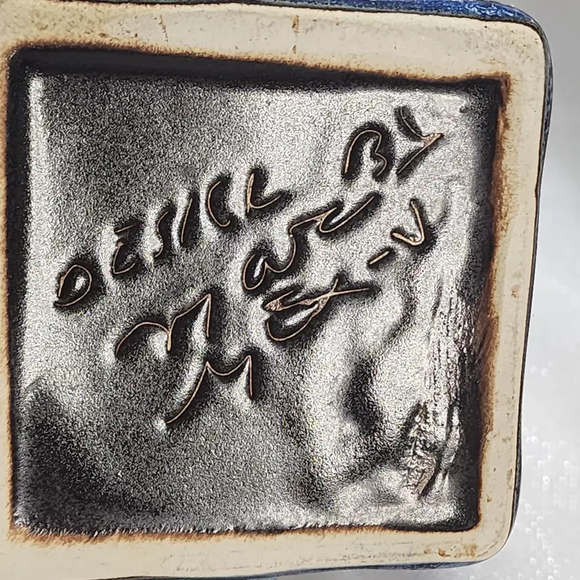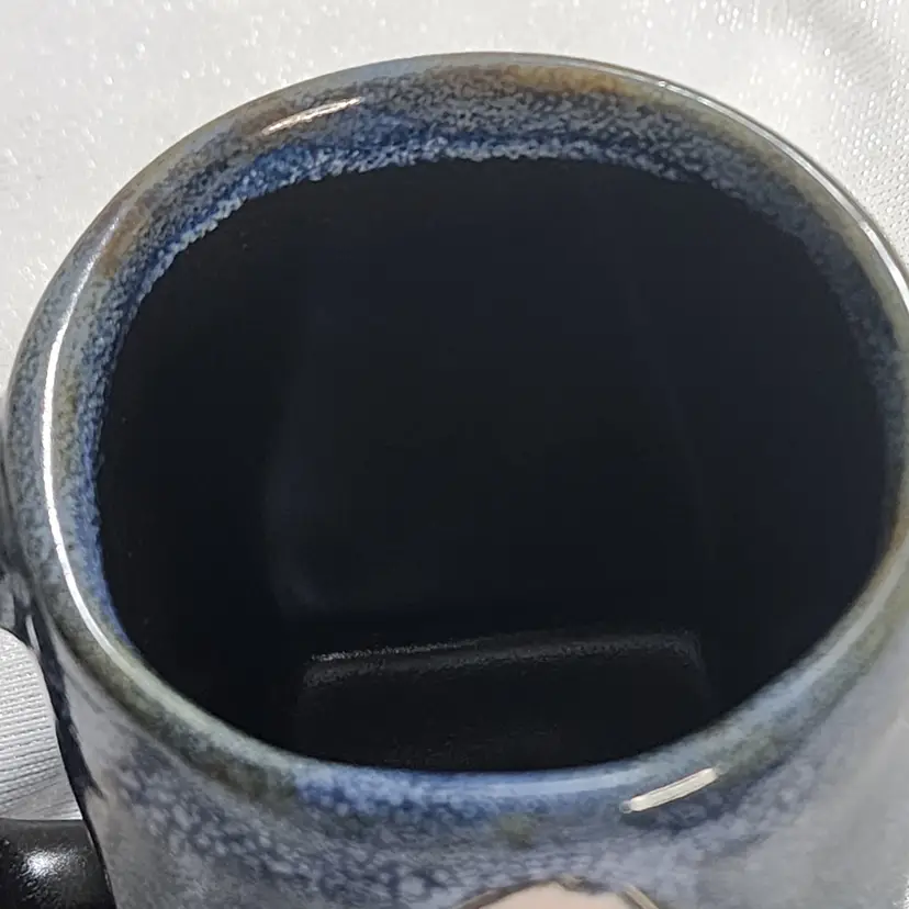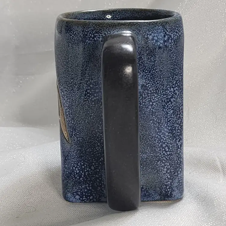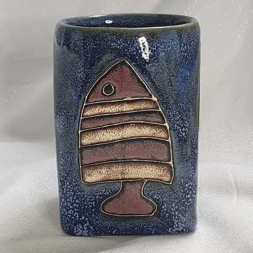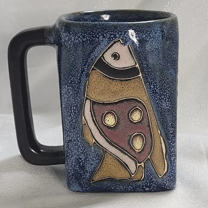 Mara Mexico mug with earth tone fish on mottled blue ground. Square bottom, round top opening. Thick, sturdy mug. Holds about 13.5-14oz