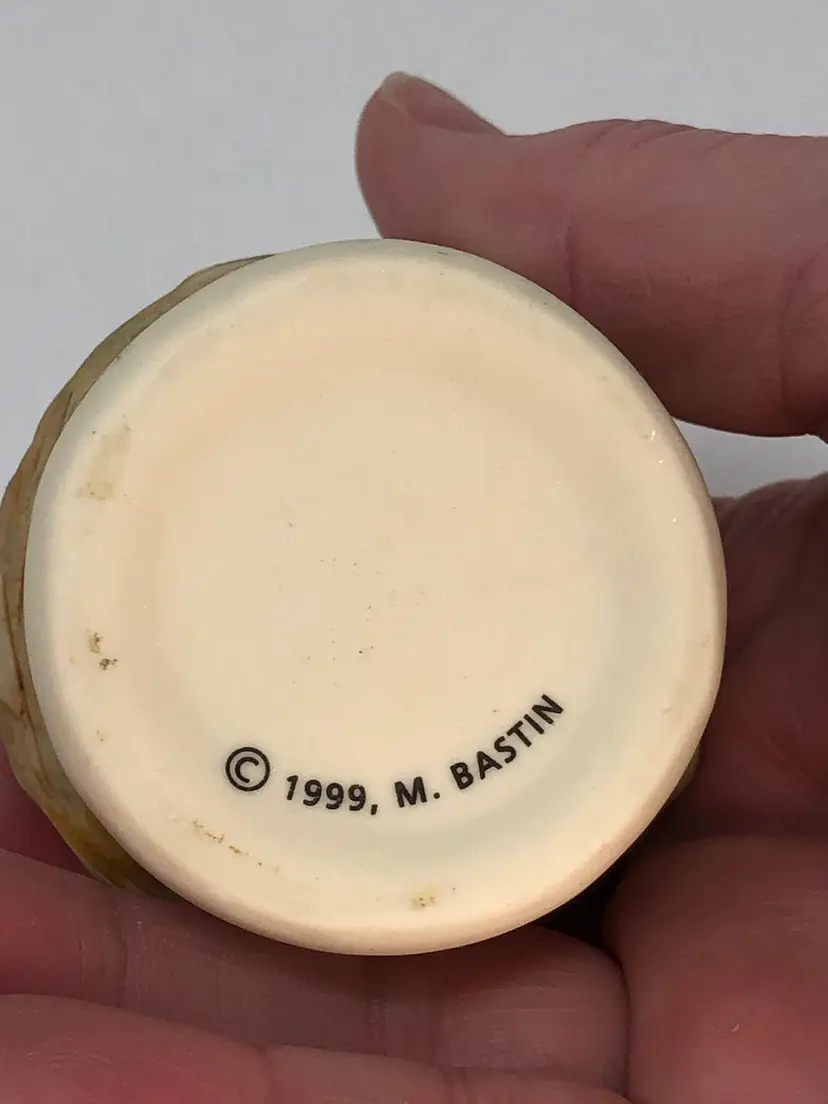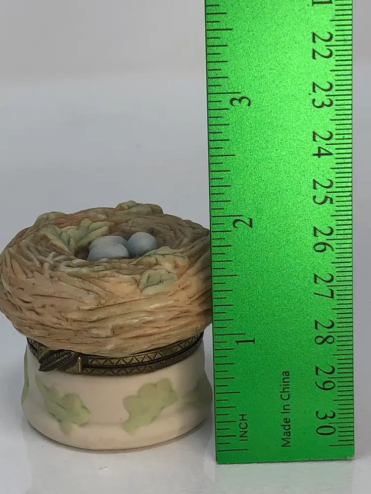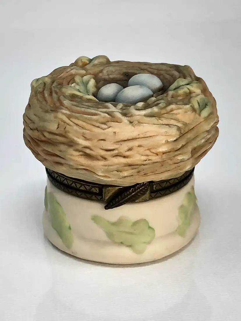 2" ceramic hinged lid trinket box looks like a bird's nest with 3 tiny eggs. Open to find the message Love begins with Mother and 6 tiny speckled eggs. Marked on the bottom 1999, M. Bastin