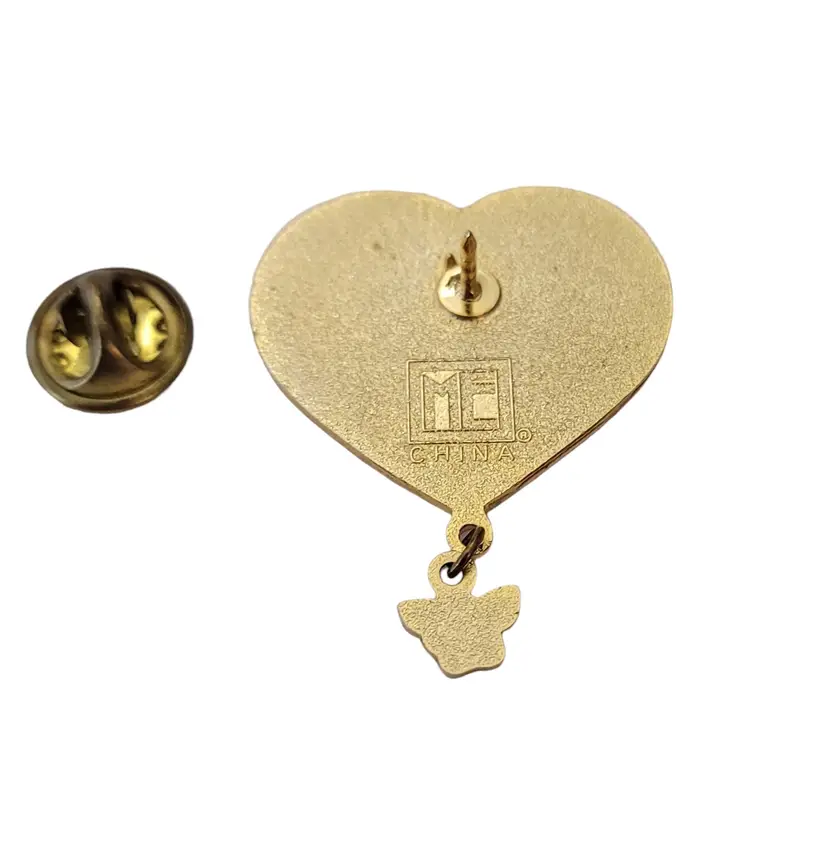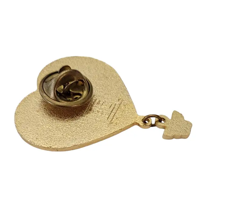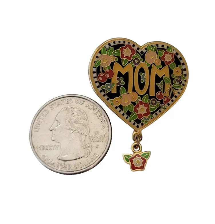 Surprise and put a smile on your mom's face with this Mary Engelbreit Flower Dangle Heart Mom Pin. This heart pin is crafted in a gold-tone base, intricately designed with lovely flower, leaf, and cherry motifs with colorful enamel details, and features the word “MOM” at the center. It has a flower with leaves charm dangling below. It measures approximately 1.5 inches in total length. Marked ME, Mary Engelbreit's markings, and CHINA on the reverse, featuring a butterfly clutch that functions properly, is easy to fix on the back and can be firmly attached to your lapel or necktie.