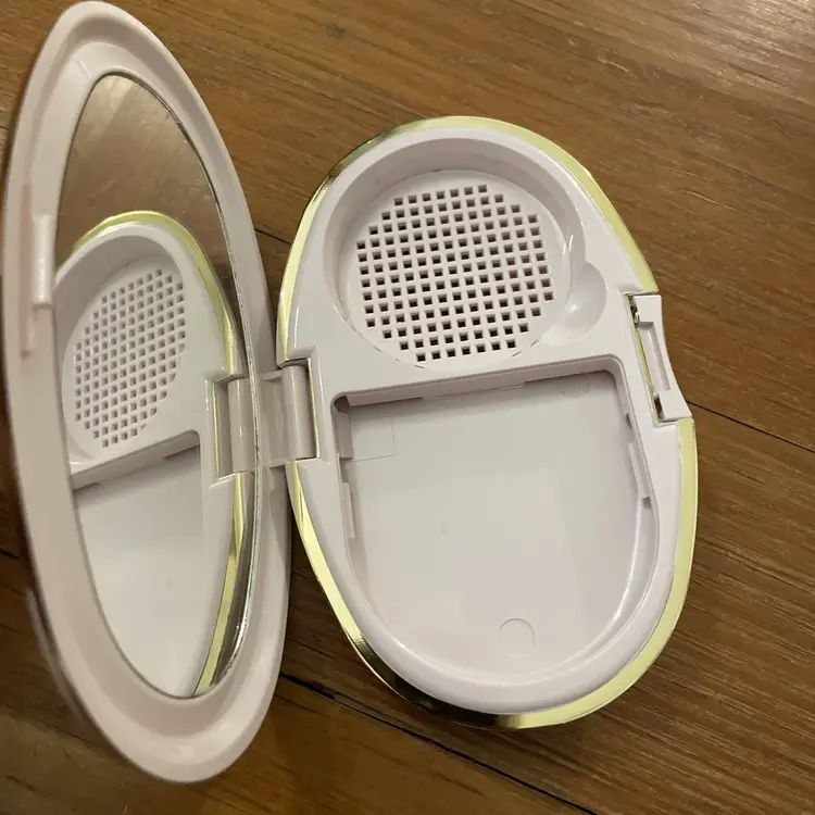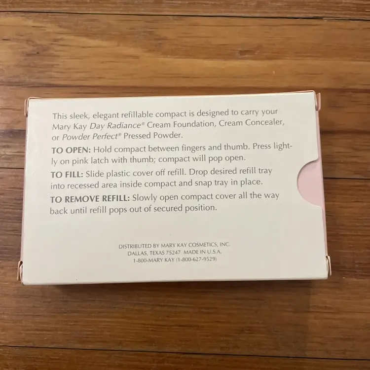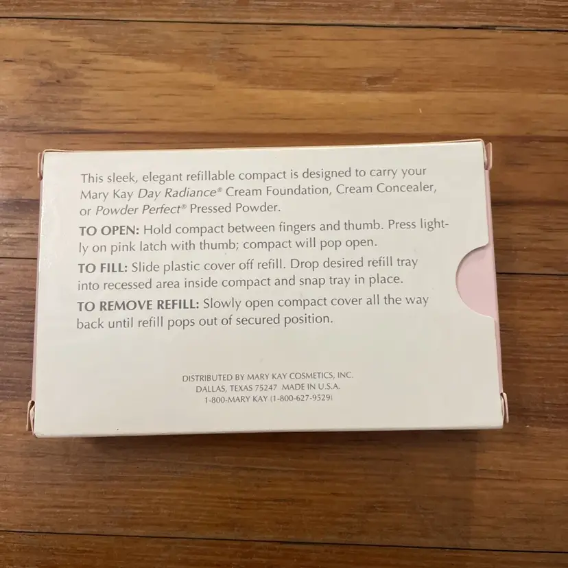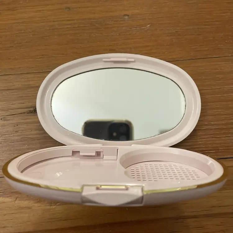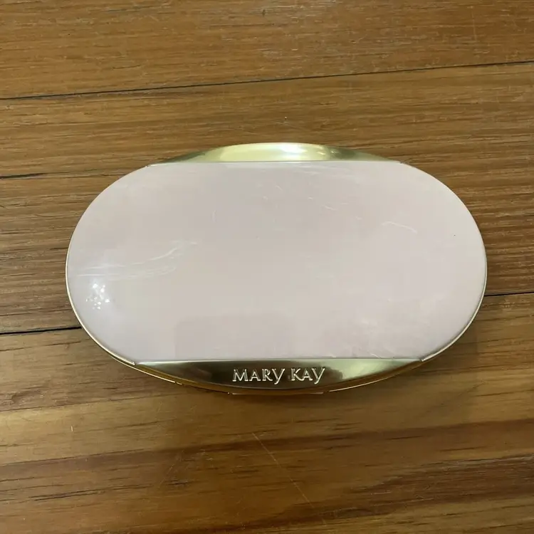 New old stock in original packaging, one discontinued, pink and gold, plastic, unfilled, oval mirror, D-shape, compact, by Mary Kay. Style number 4904. For use with Mary Kay Day Radiance cream foundation, cream concealer or Powder Perfect pressed powder. In great unused condition.