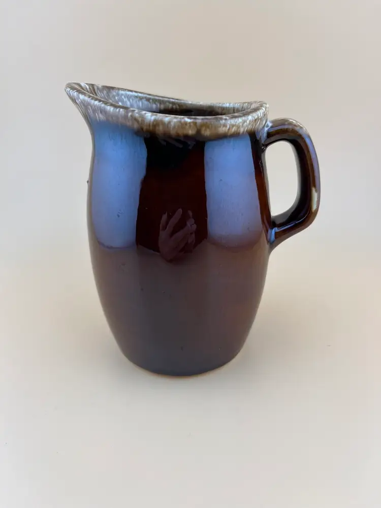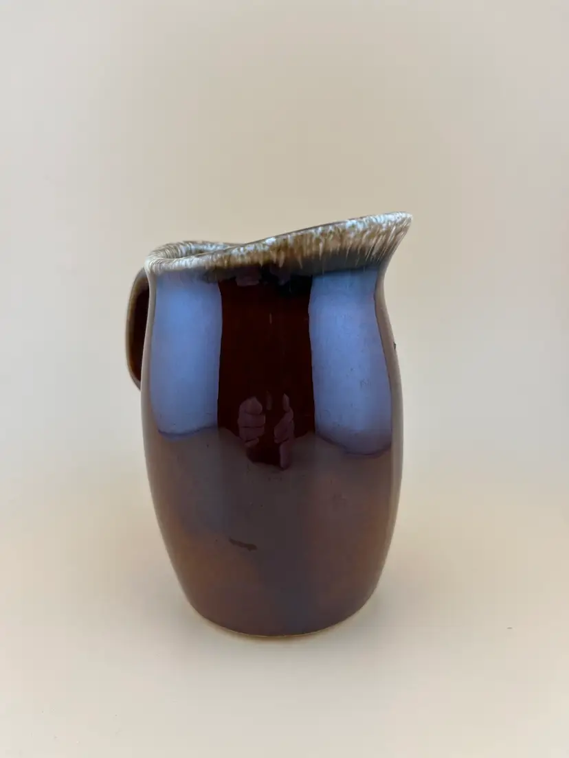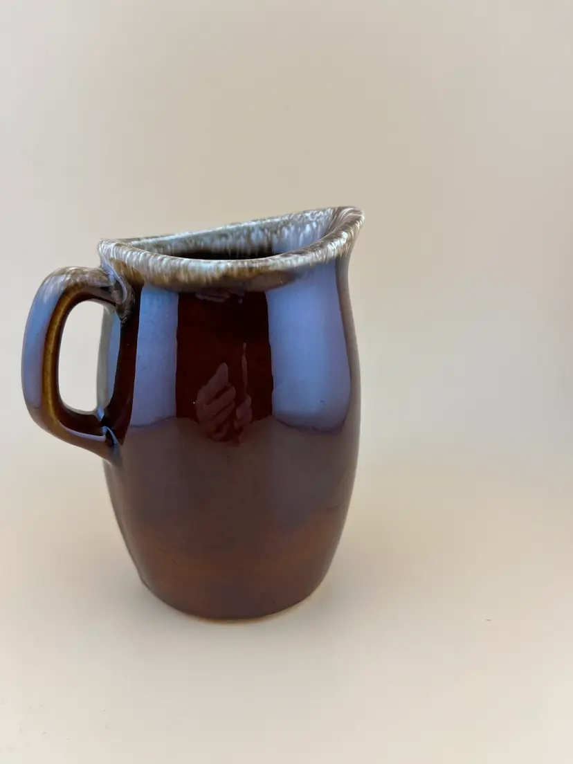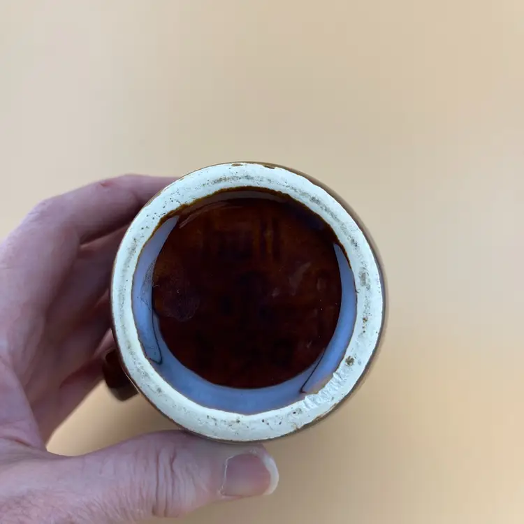 Is marked but is very faint. Brown drip glaze. Small scrape on handle. Approx 4.25” tall,