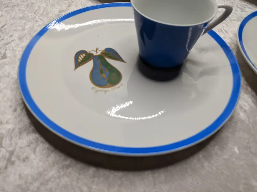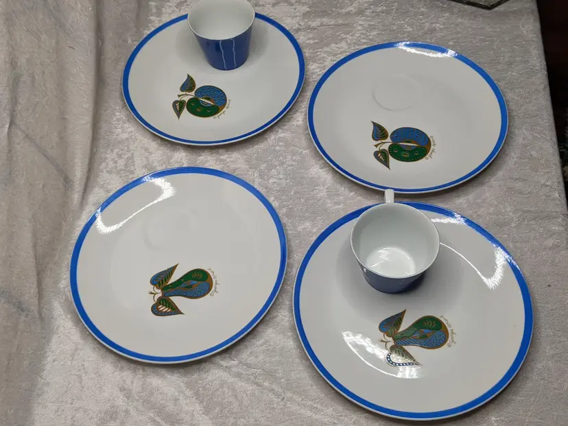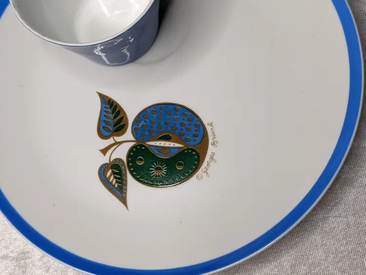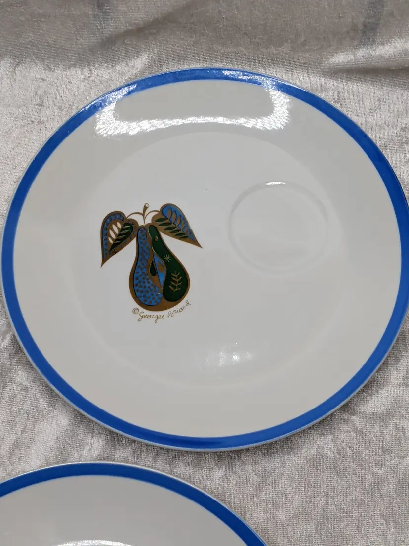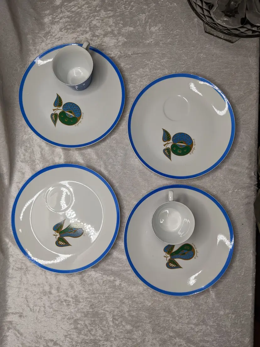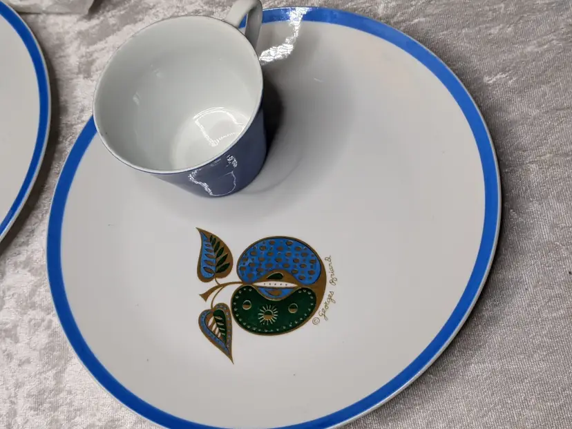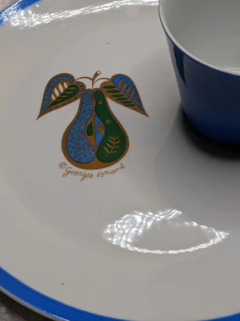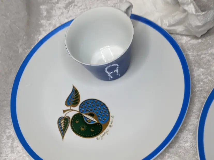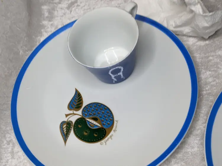 MCM George Briard snack plates set of 4 Forbidden Fruit 2 Apple 2 Pear 2 cups luncheon Blue on white background with gold outline. The plate is 9 1/2in wide and the cup is 3 1/4in tall and 2 1/2 in wide.Great condition Clean with no damage.no chips or cracks no weird smells. Please check the photos for details. Comes from a smoke free home. We do have pets.