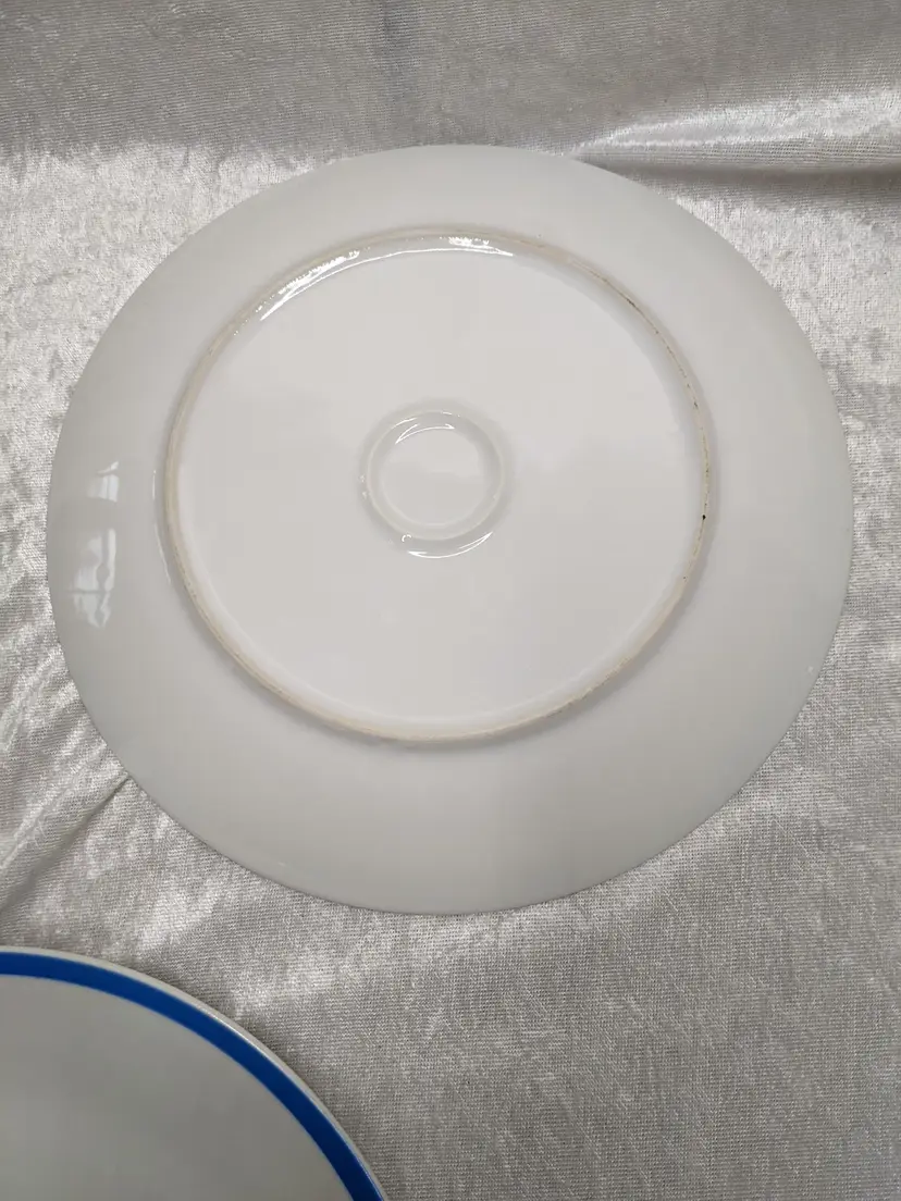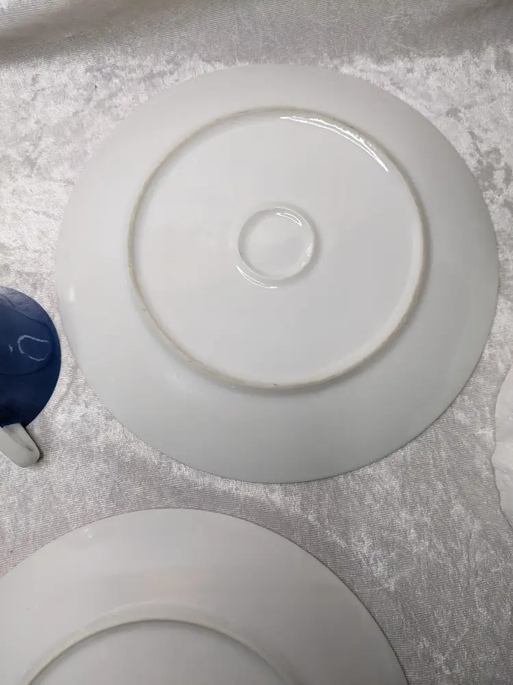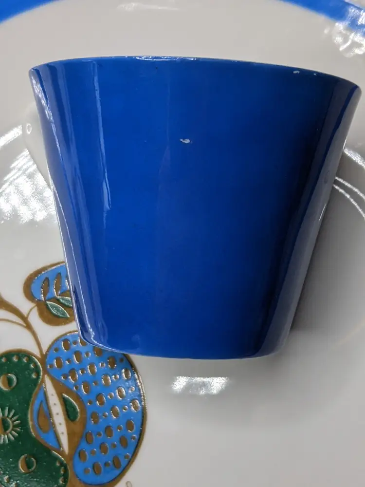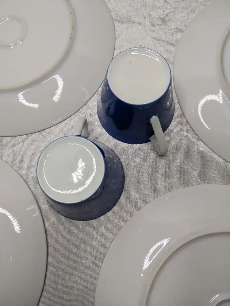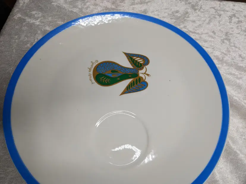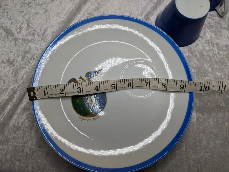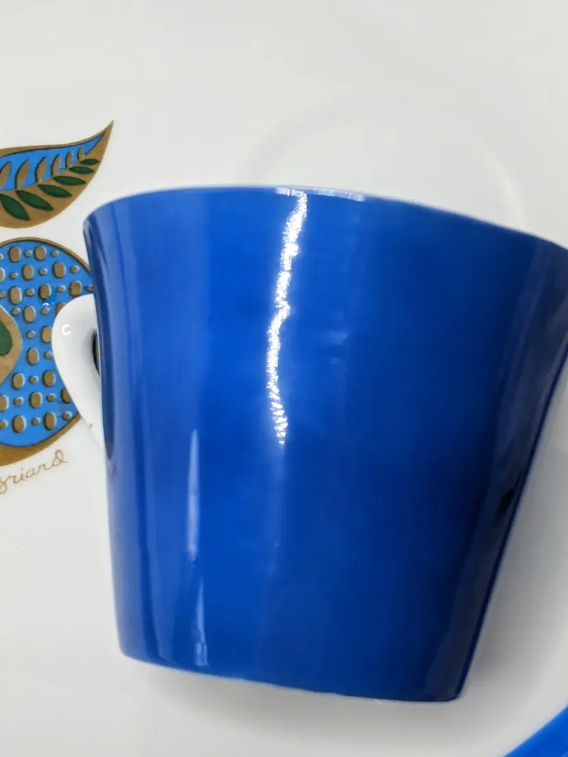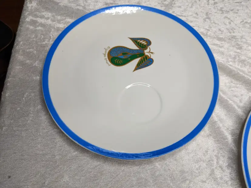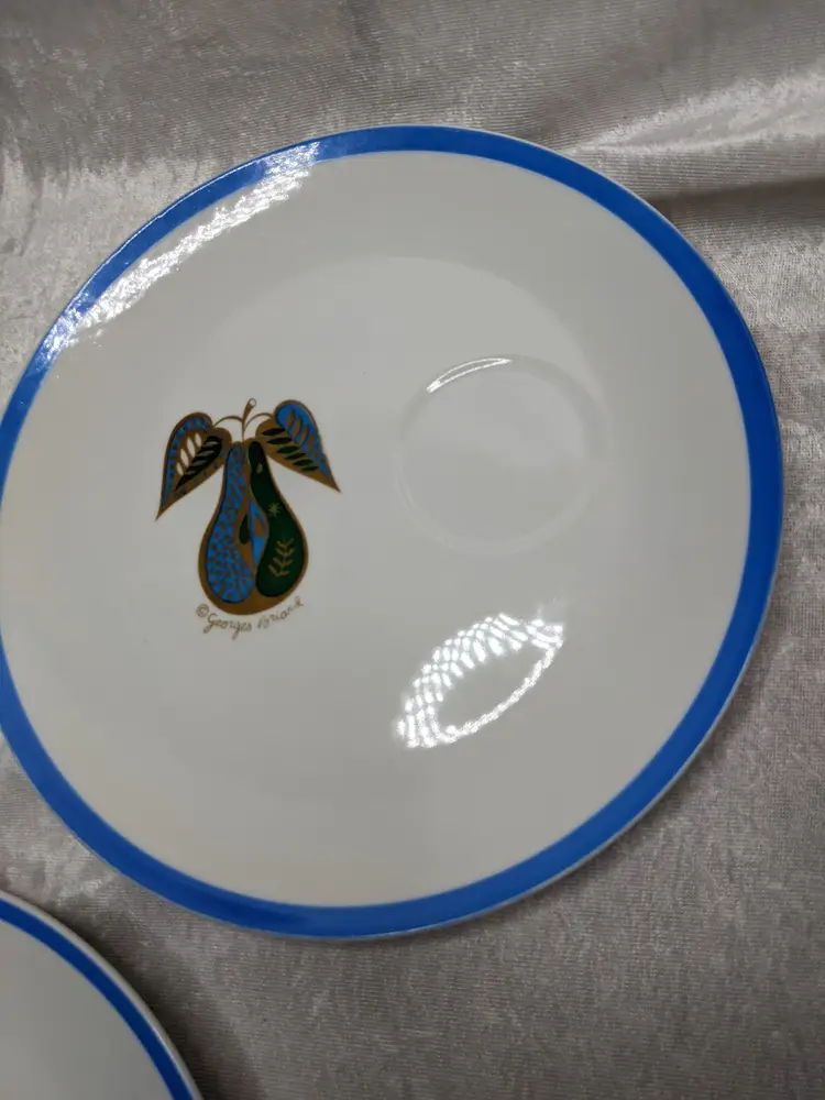 MCM George Briard snack plates set of 4 Forbidden Fruit 2 Apple 2 Pear 2 cups luncheon Blue on white background with gold outline. The plate is 9 1/2in wide and the cup is 3 1/4in tall and 2 1/2 in wide.Great condition Clean with no damage.no chips or cracks no weird smells. Please check the photos for details. Comes from a smoke free home. We do have pets.