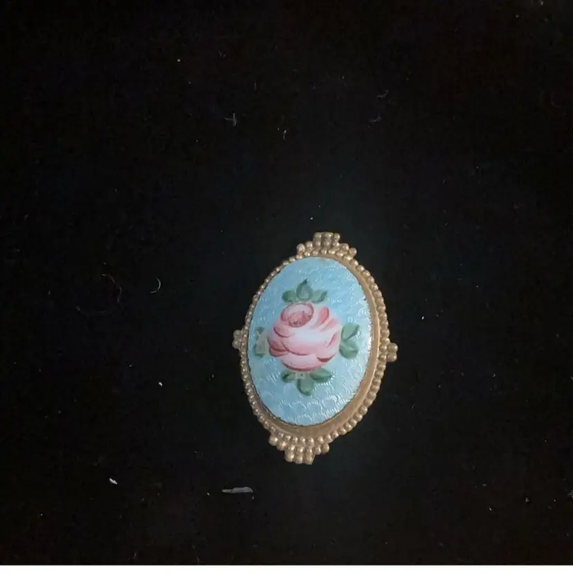 MCM Guilloche Enamel Brooch Hand Painted Pink Rose
