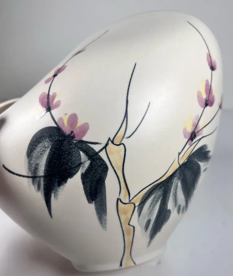 This exquisite ceramic vase boasts an intricate design of bamboo, birds, and floral patterns, showcasing the unique mid-century modern style of Western Germany. The piece, created by artist Georg Schmider, is a vintage original in excellent condition. The matte finish and decorative features make it a timeless addition to any collection.
