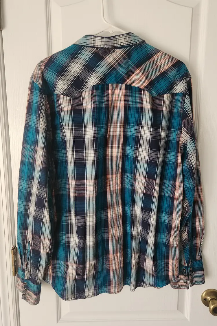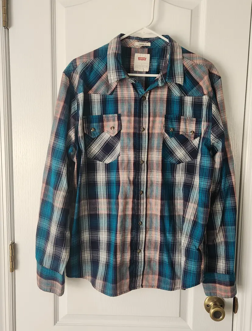 Very nice Levi's shirt. The shirt is blue plaid with pearl snaps. Size large. It is in excellent condition. There are no holes, stains, or rips.