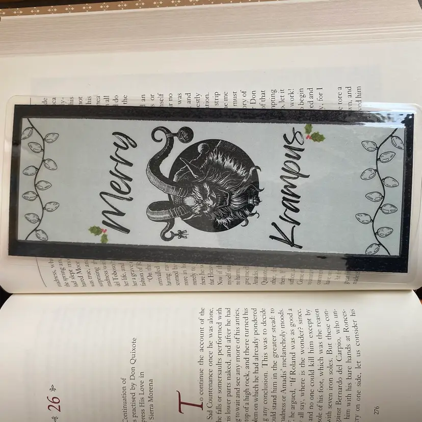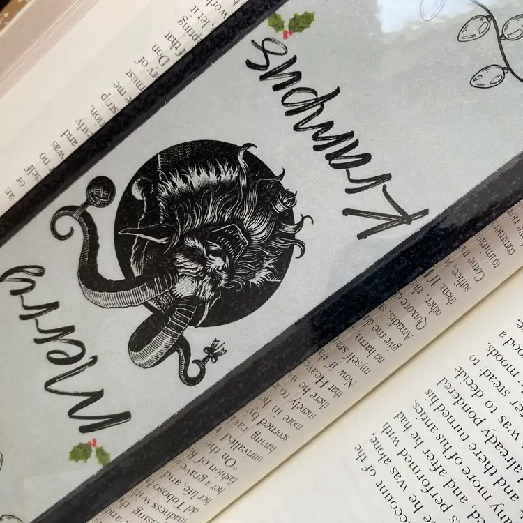 Oversized style bookmark to keep you off Krampus’ list! Reinforced with black cardstock and blank on the back. Laminated with 5MIL. No tassel.