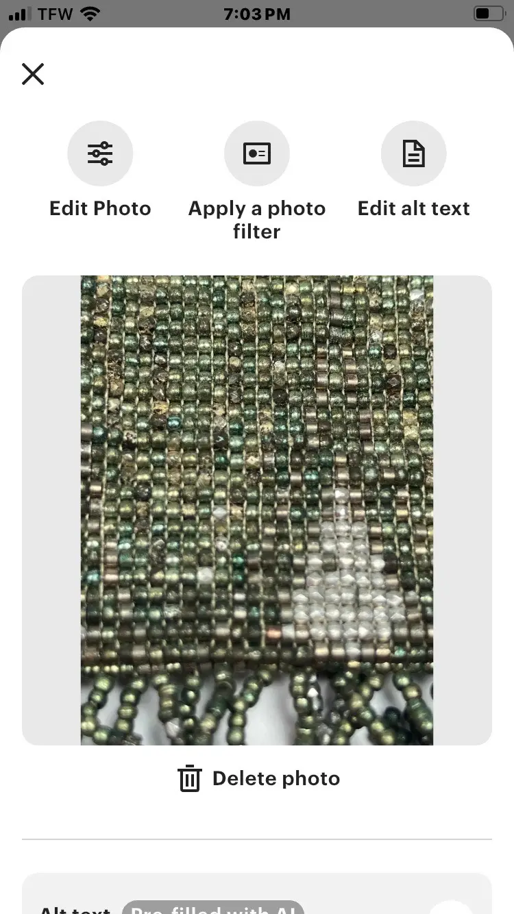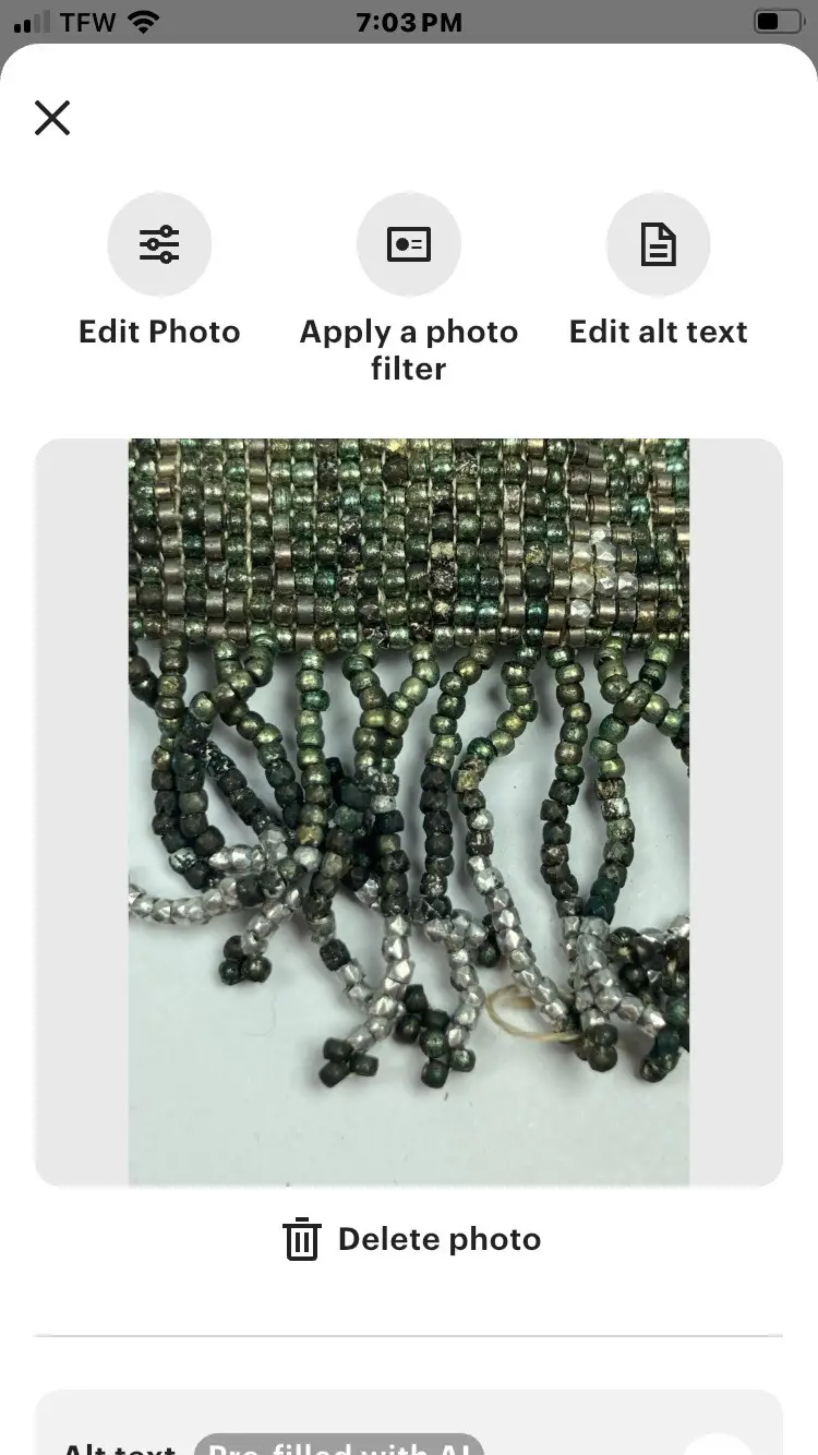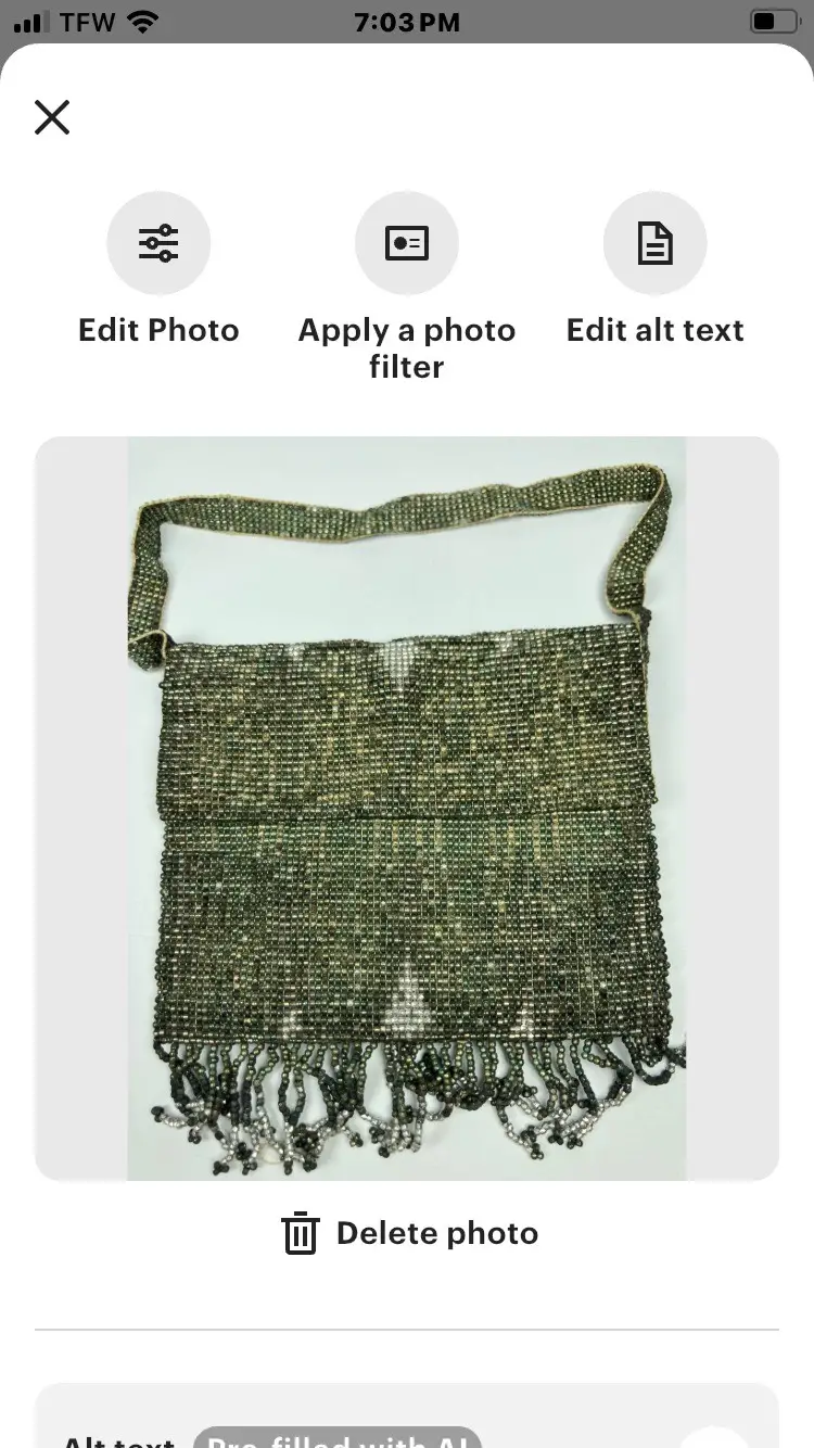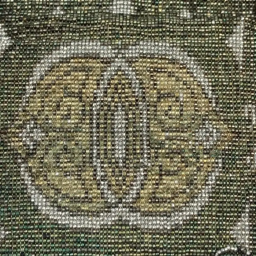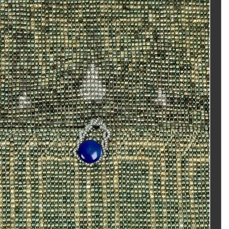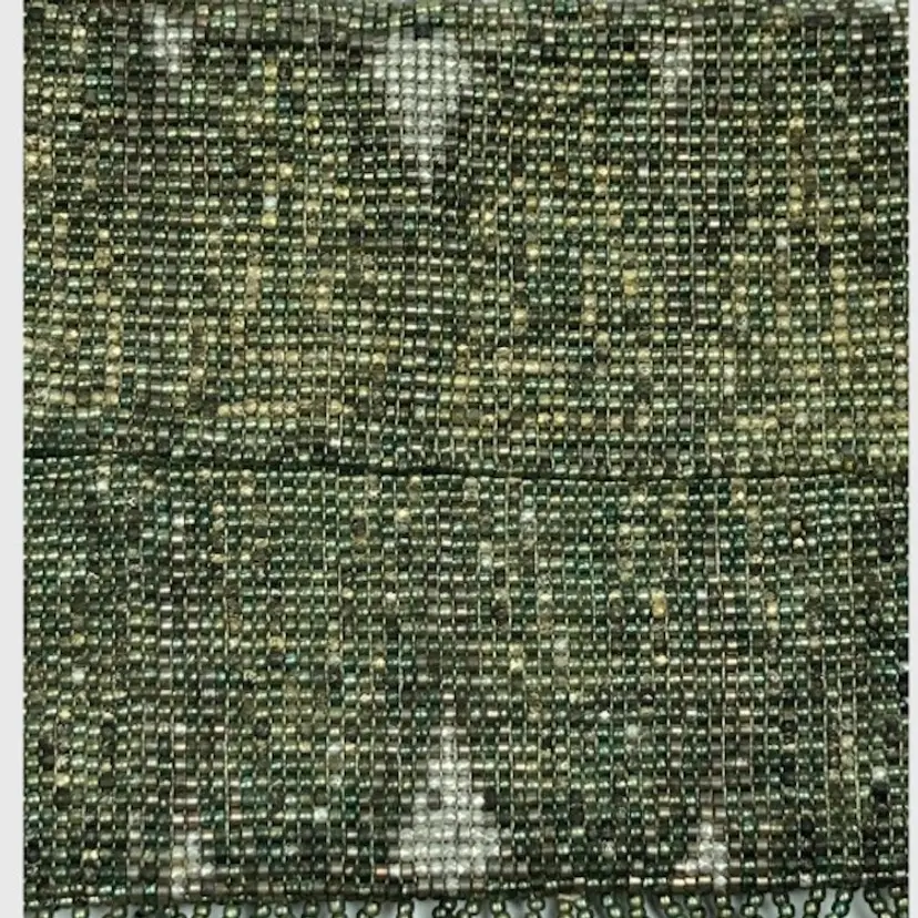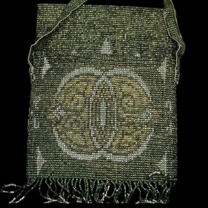 This micro beaded French made ’Art Deco micro beaded small coin purse with flap over for closure, is in very good condition for its age and is missing no beads and has no rips. Truly a piece of art and history the different colors of gold, silver,and green beads just make it sparkle. Great add to anyone’s collection of vintage purses.