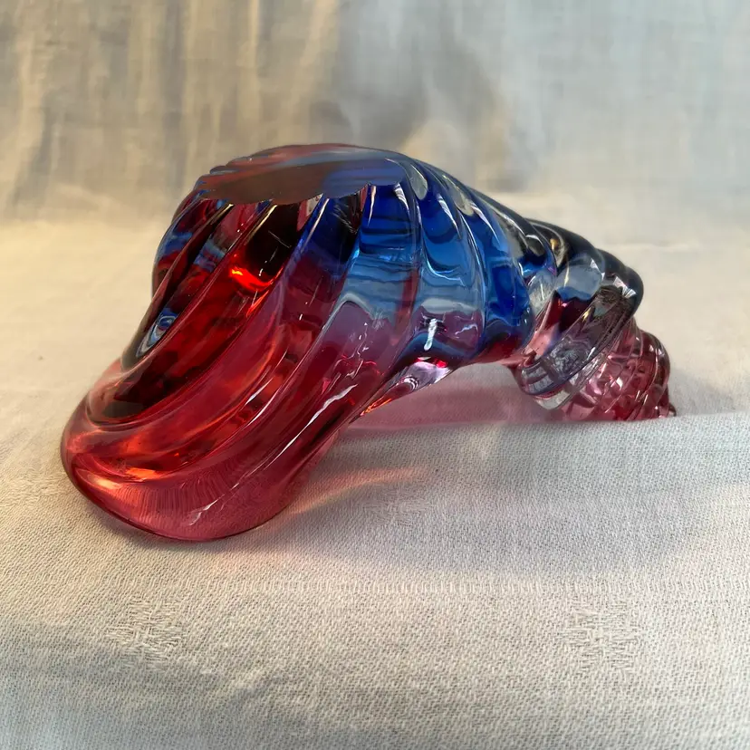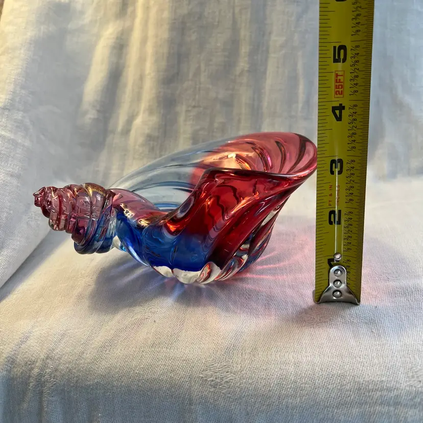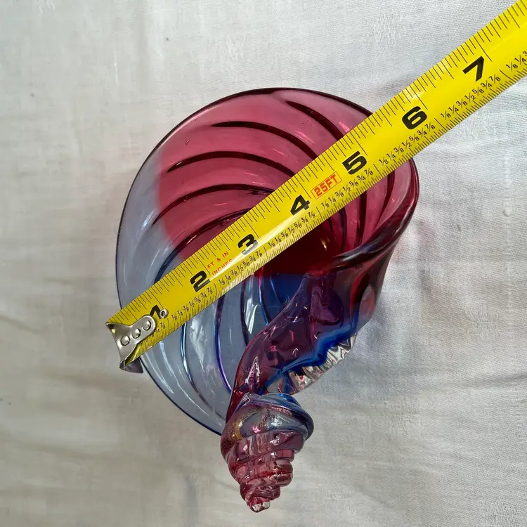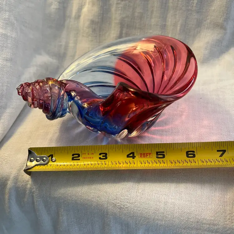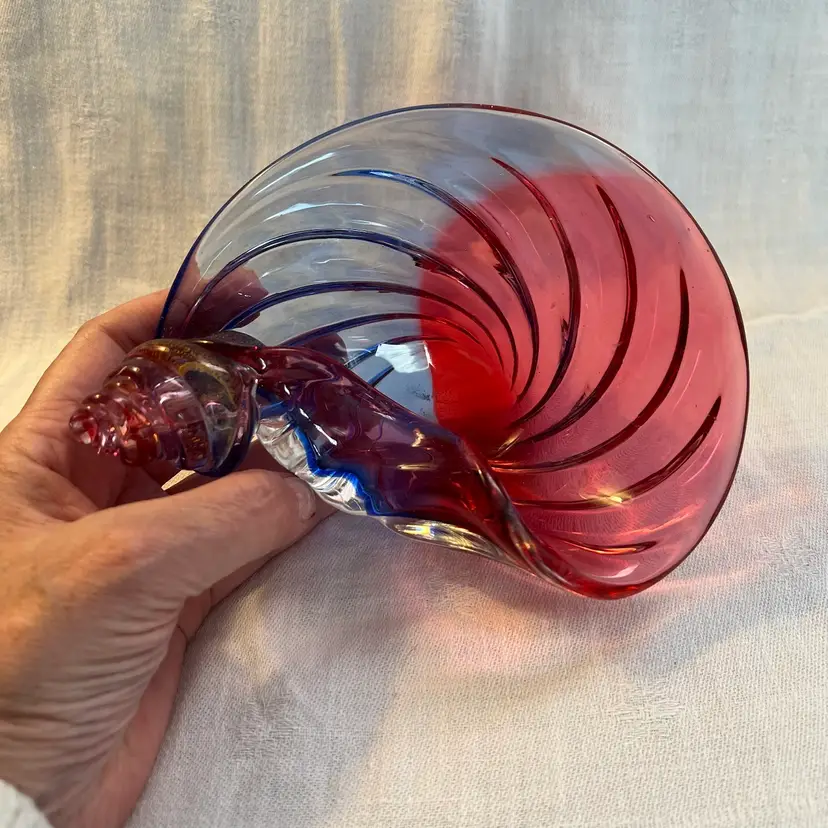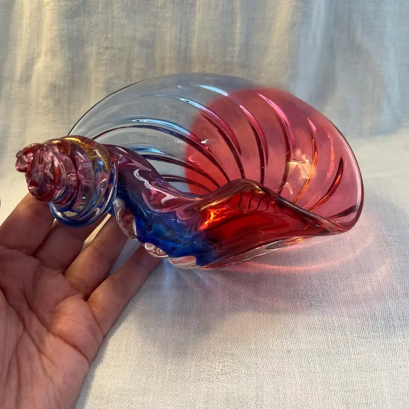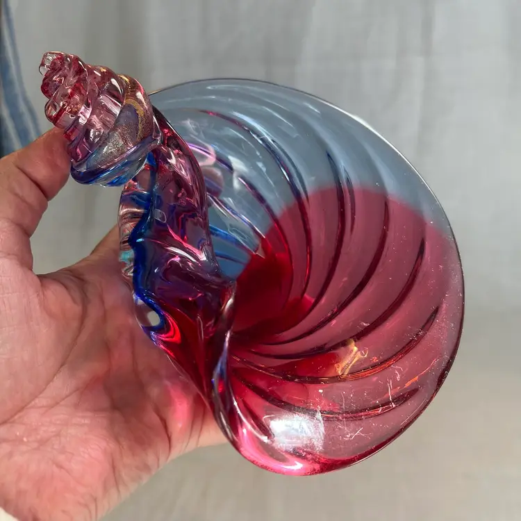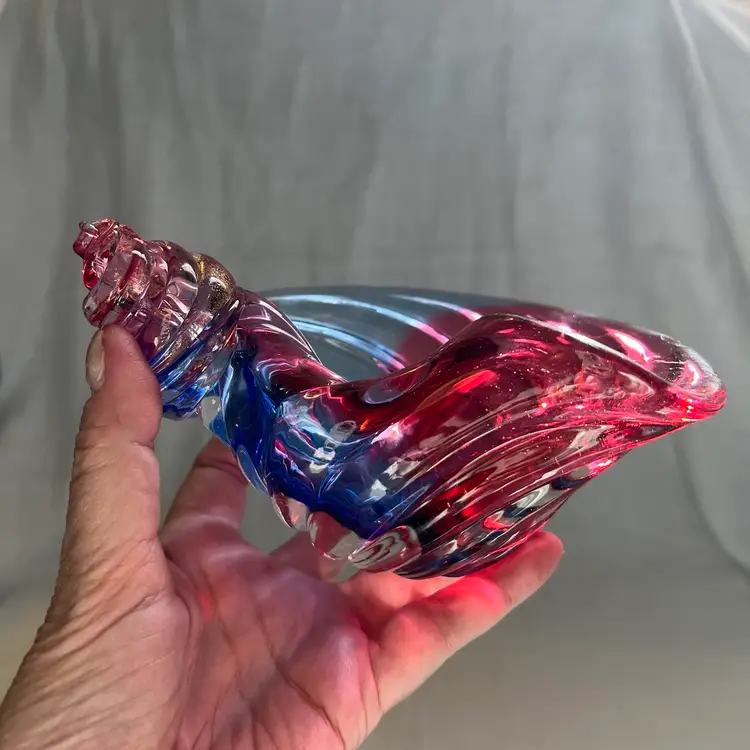Stunning shell-shaped, neodymium and cranberry colored, flecked with gold, studio art glass dish. High polished base. Beautiful piece! Measurements in photos.