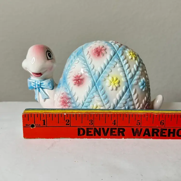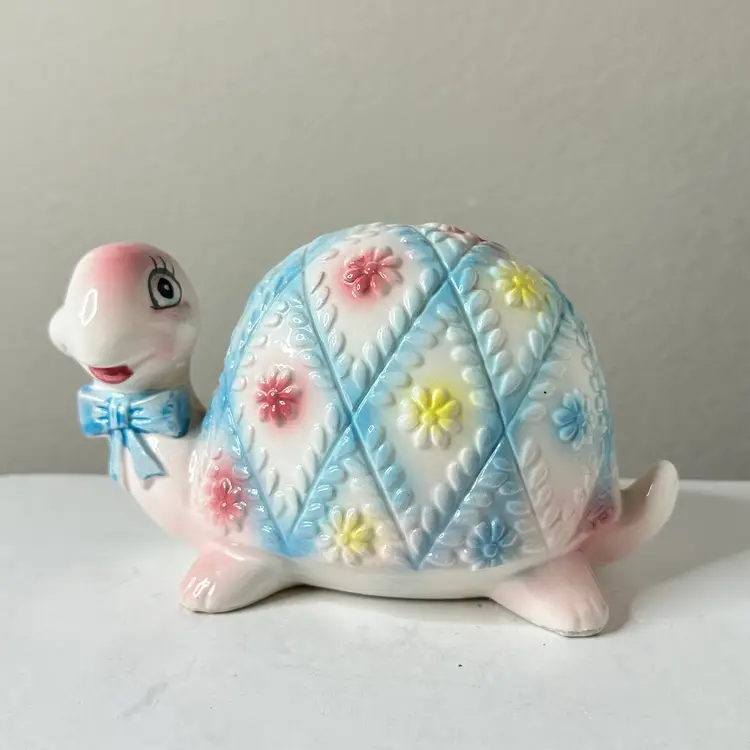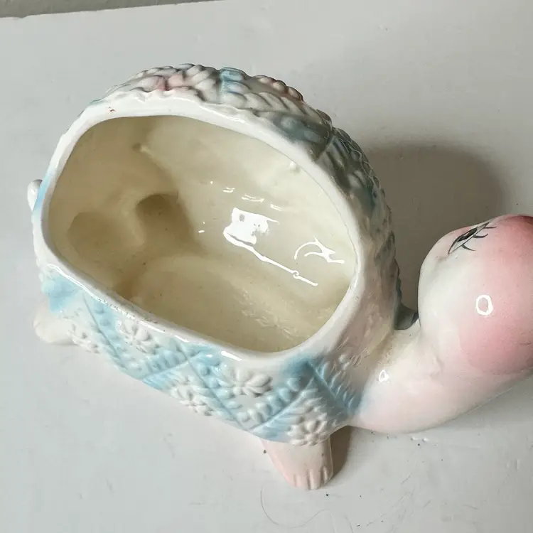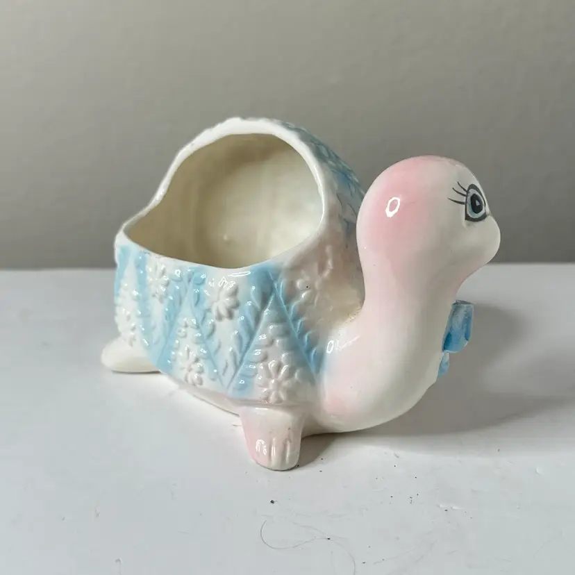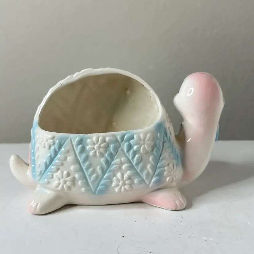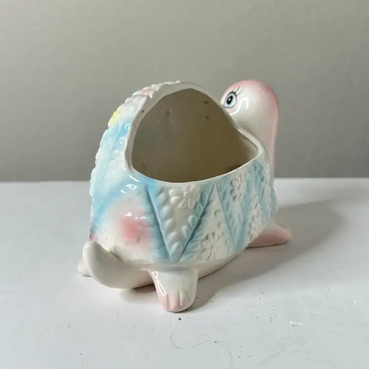 This midcentury turtle anthropomorphic planter is a vintage sculpture made of porcelain in Japan. Handmade and featuring a kitschy design, this figurine showcases a unique representation of a turtle. With its anthropomorphic style and detailed craftsmanship, this piece is sure to be a standout collectible for any animal or reptile enthusiast.