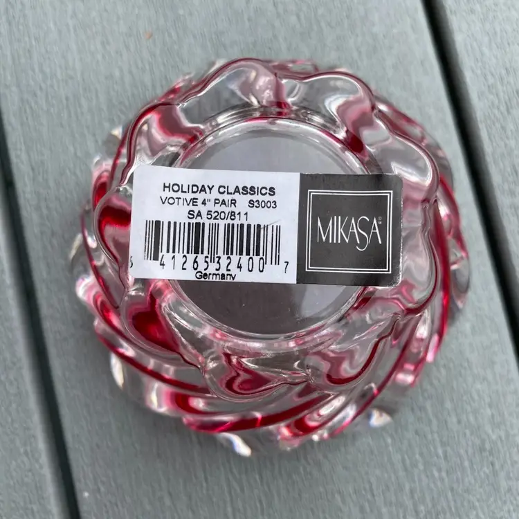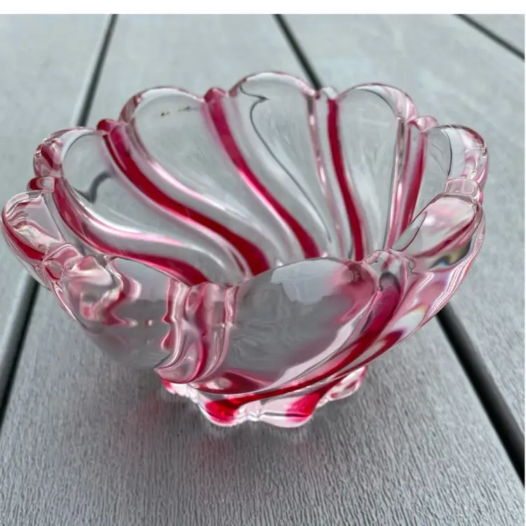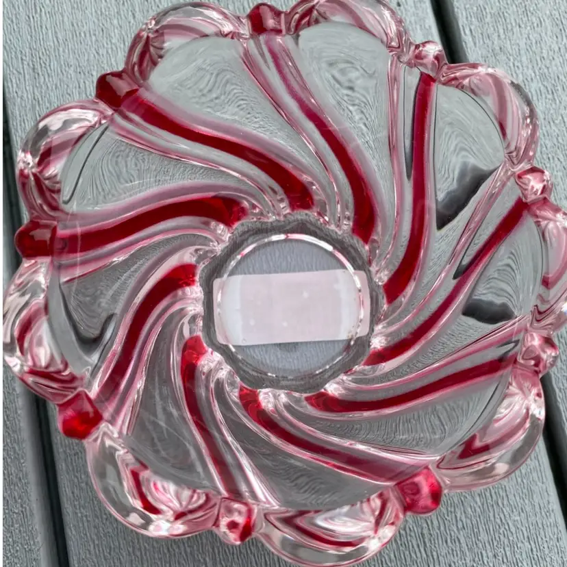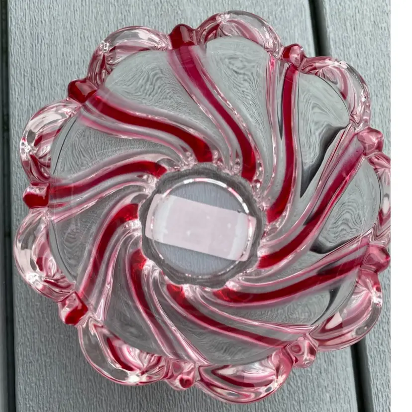 This is an adorable vintage Mikasa “PEPPERMINT SWIRL” bowl. It is a heavy glass bowl with a red and clear swirled pattern and a pretty scalloped edge. It is in like new condition and still has its original tag. This bowl would be lovely displayed all year round, but would be especially sweet filled with candy at Christmas time.