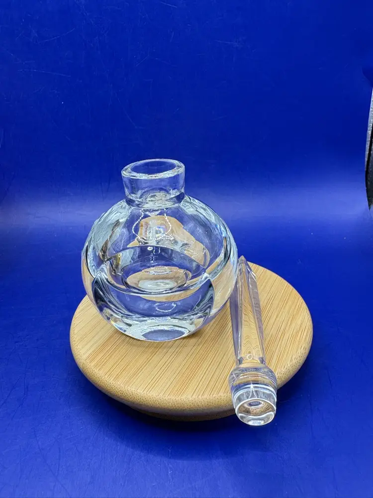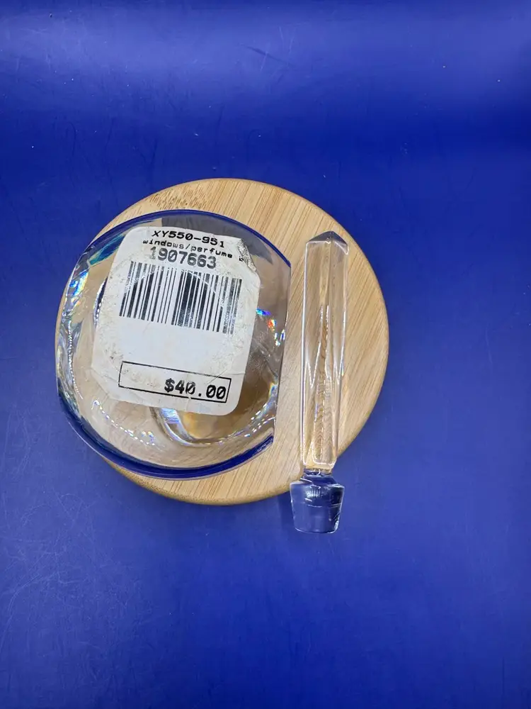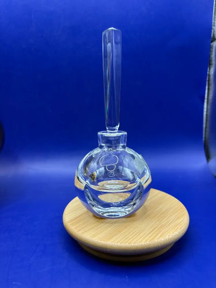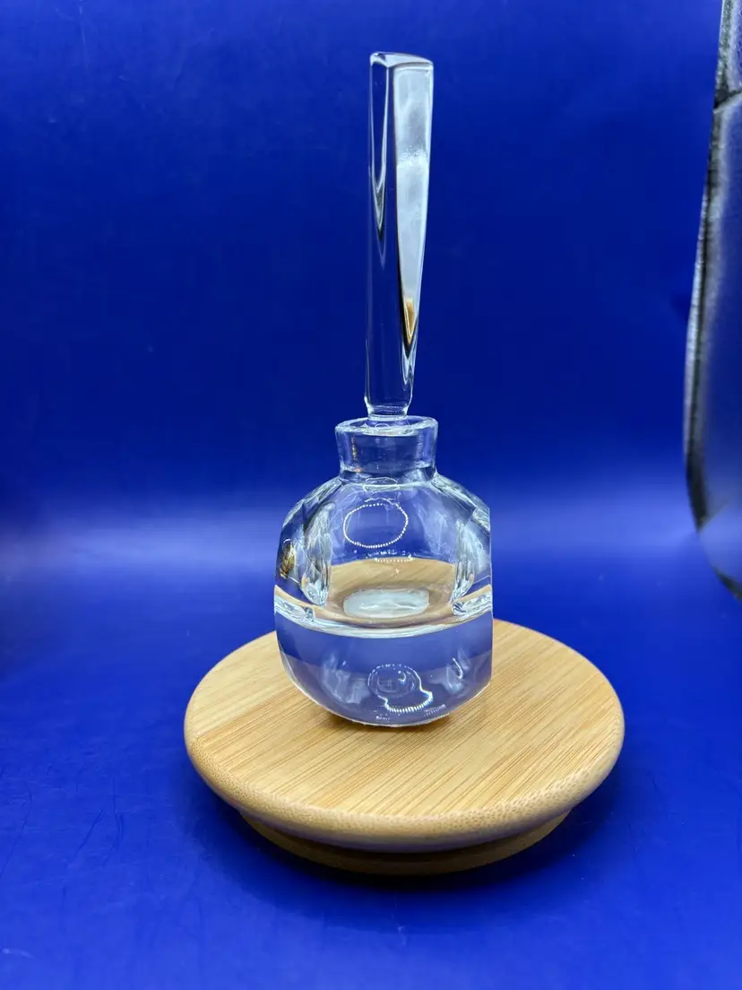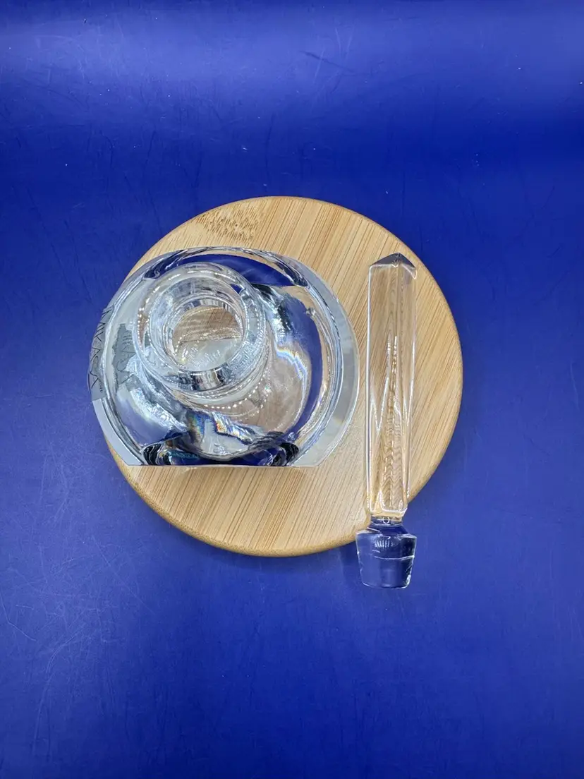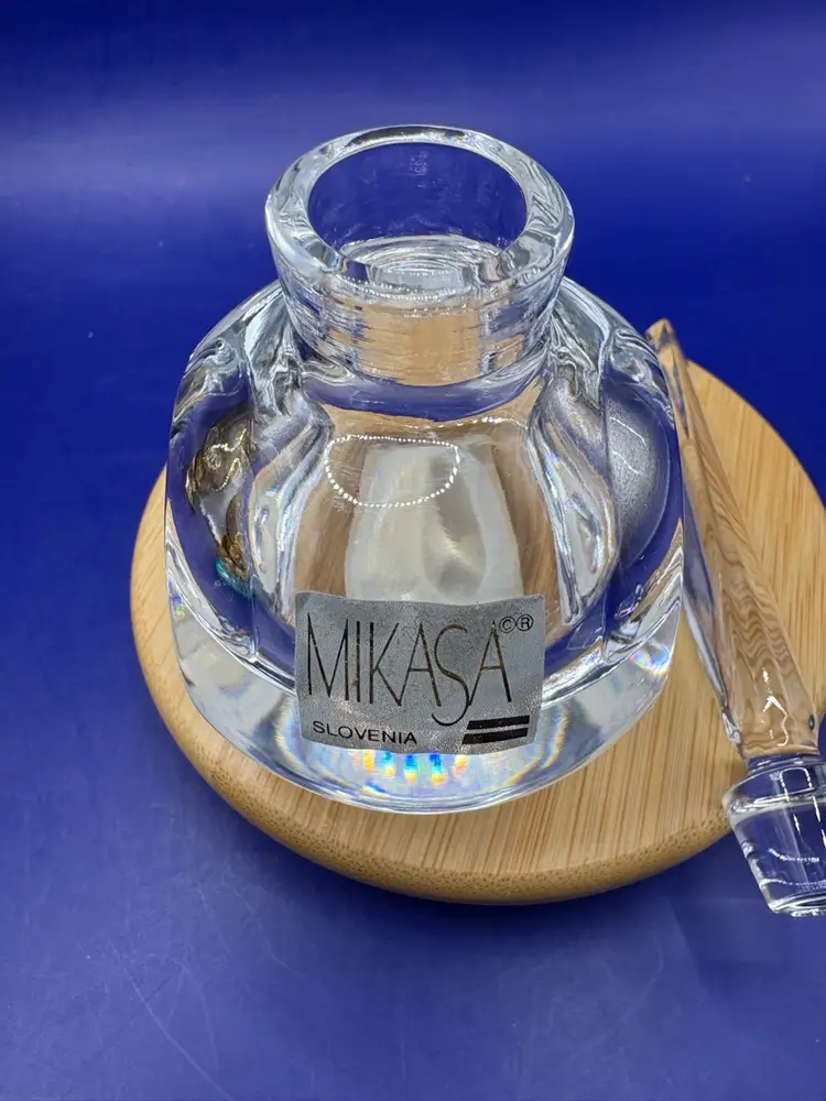 Mikasa Slovenia Clear Glass Perfume Bottle Round cut crystal with flat front and back Stopper is in triangular in shape Measures 6 inches tall with stopper Base is 2 1/2 at widest No chips or cracks