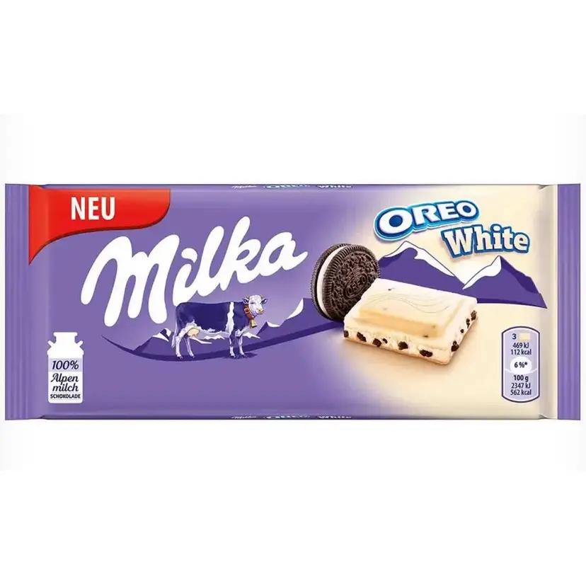 Milka Oreo White Smooth white milka chocolate and a creamy, crunchy Oreo chocolate cookie center. 3 oz. Product of Germany 🇩🇪 Exp: 5/15/25