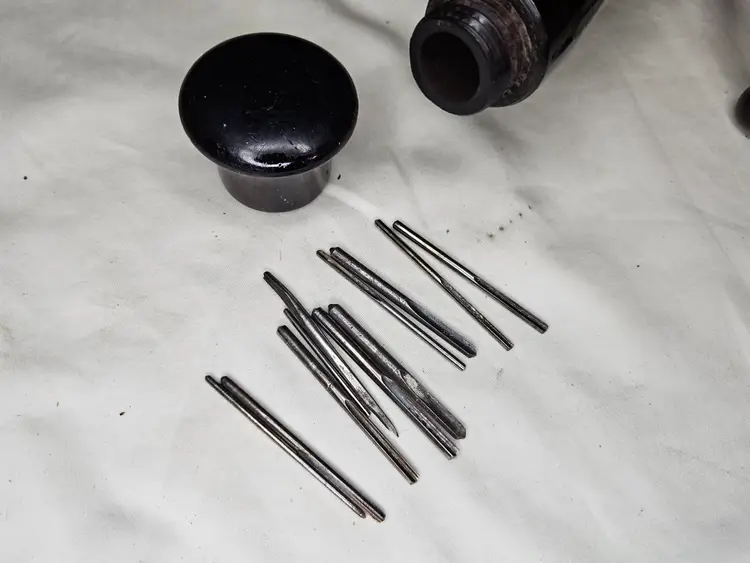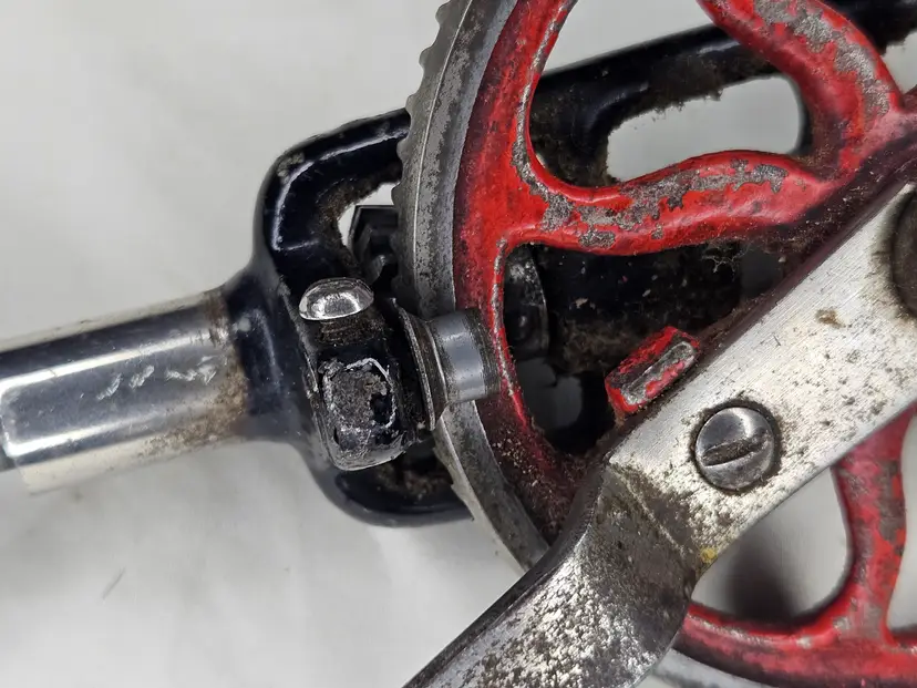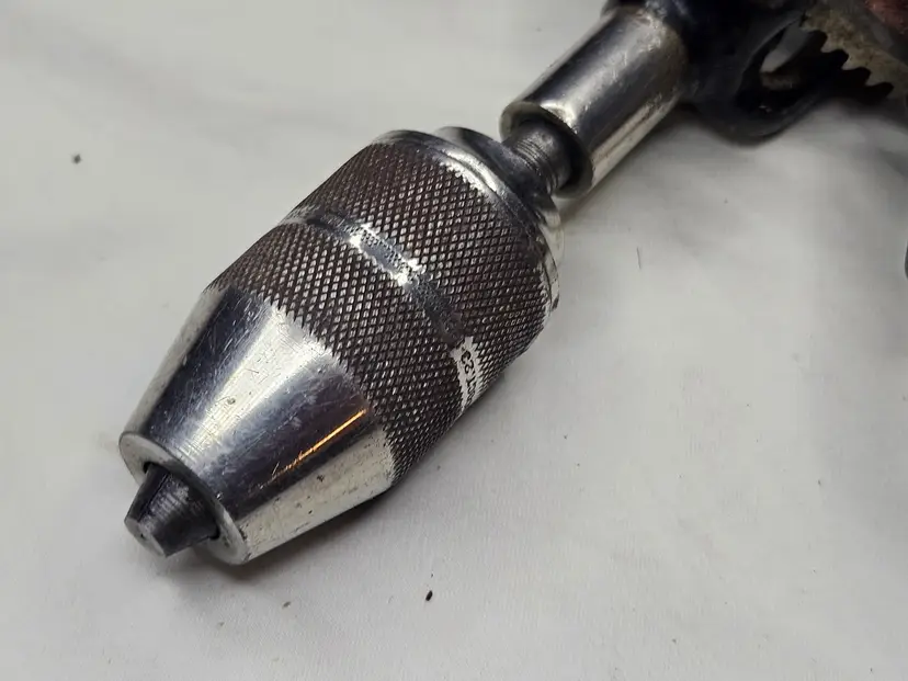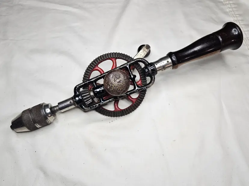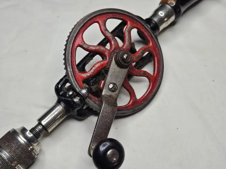 This is one of my favorite hand drills featuring a cocobolo handle with contrasting light sapwood and dark heartwood color. The No. 2D drill has a friction roller, that serves to maintain proper alignment between the main gear and the single pinion gear along their pitch lines, reducing backlash and enabling precise, smooth rotation under load. This is the only example I have in my collection with a friction roller. Drill is in good overall condition and spins freely, but could use a good cleaning and some oil. No issues with the chuck. Many bits stowed in the handle as shown in the photos.