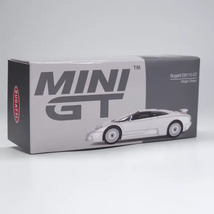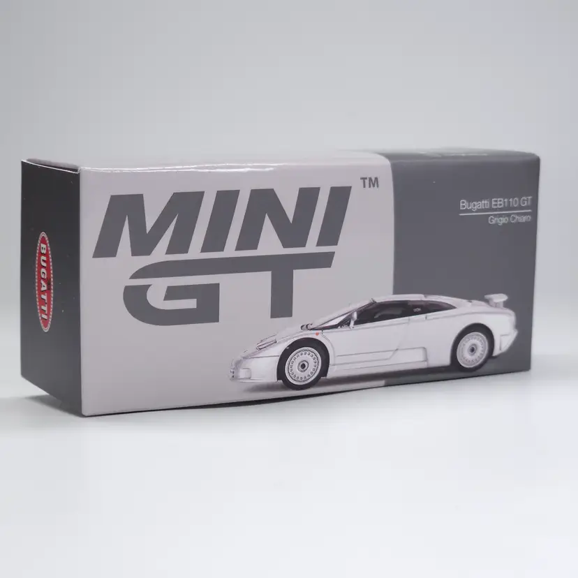 Mini GT Bugatti EB110 GT Grigio Chiaro #704. Package is rated in EXCELLENT condition. 1:64 Scale