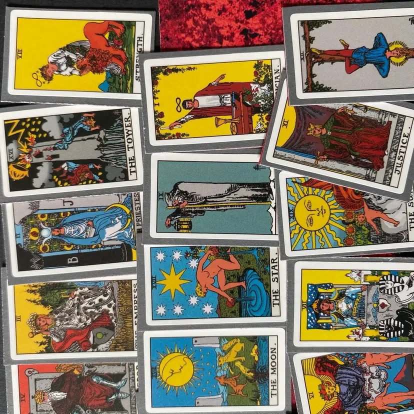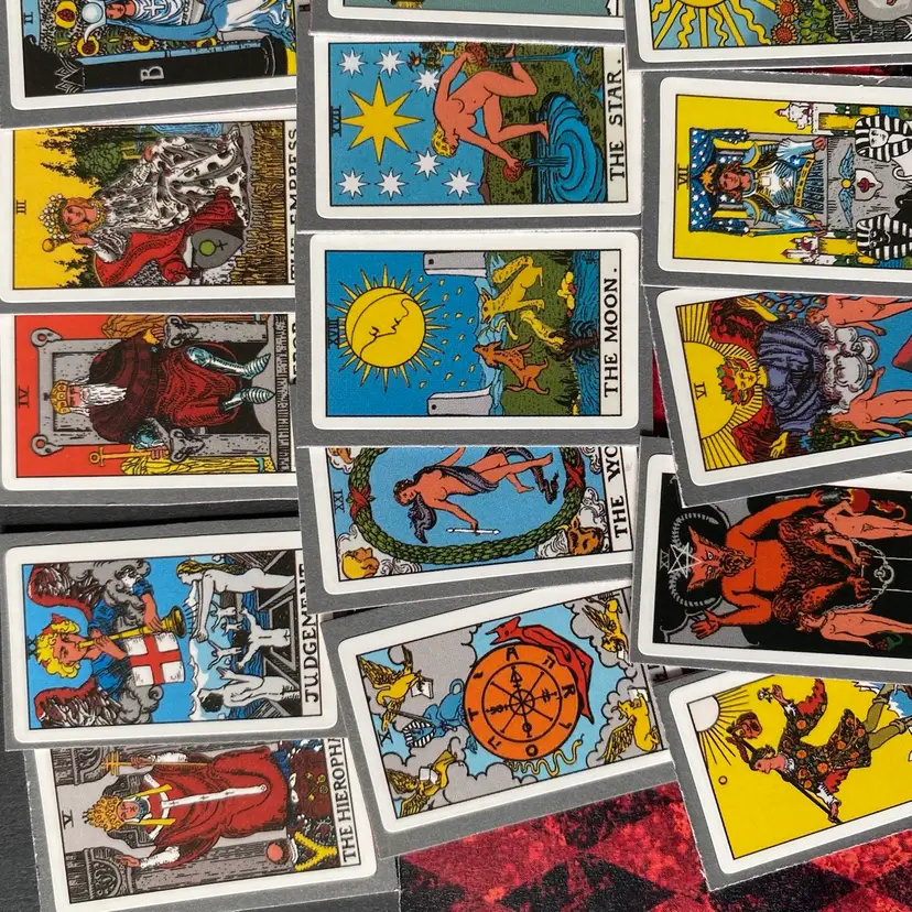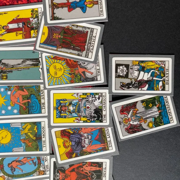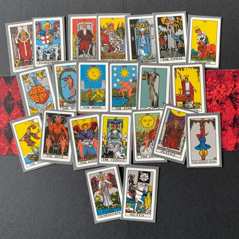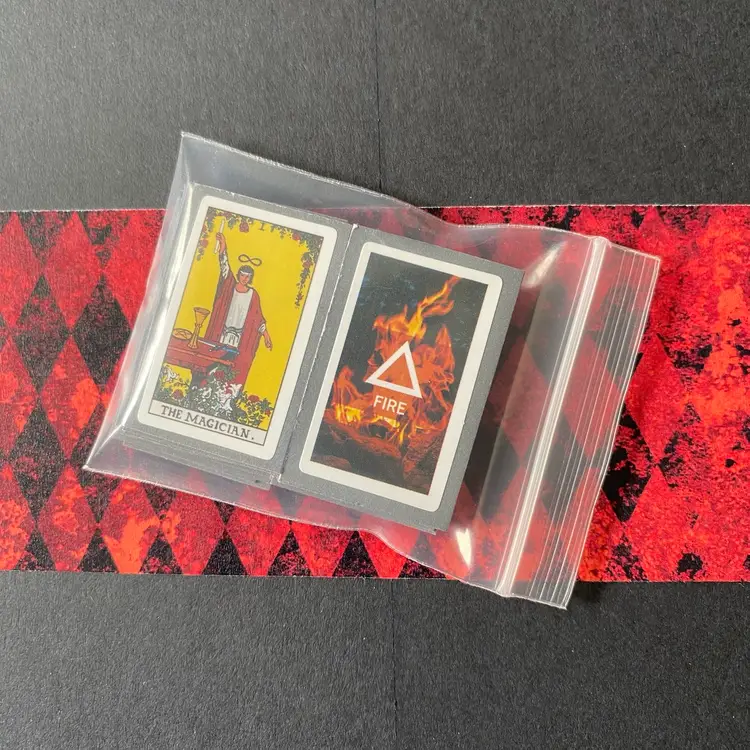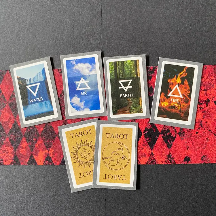 Includes 28 cards. 22 major arcana, 4 elements, and 2 Sun and moon cards. Not laminated. Made with cardstock and unique pattern behind each card. Size is approximately 1 1/4” x 3/4”.
