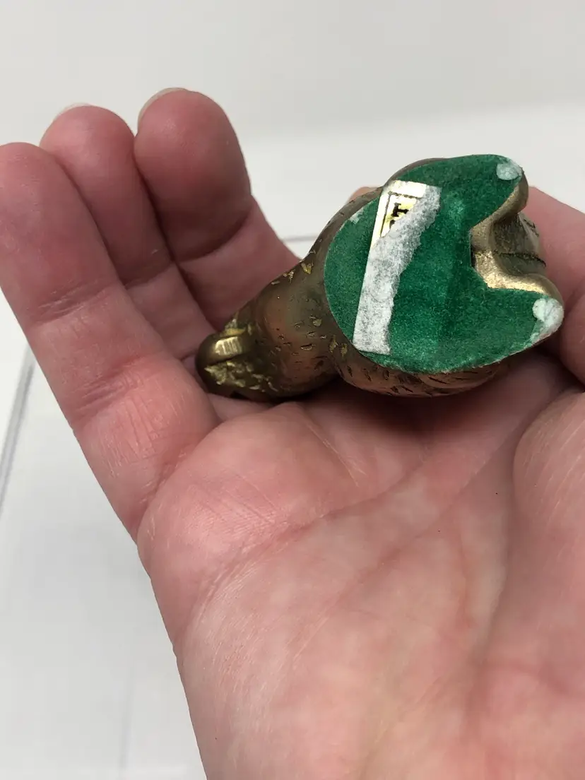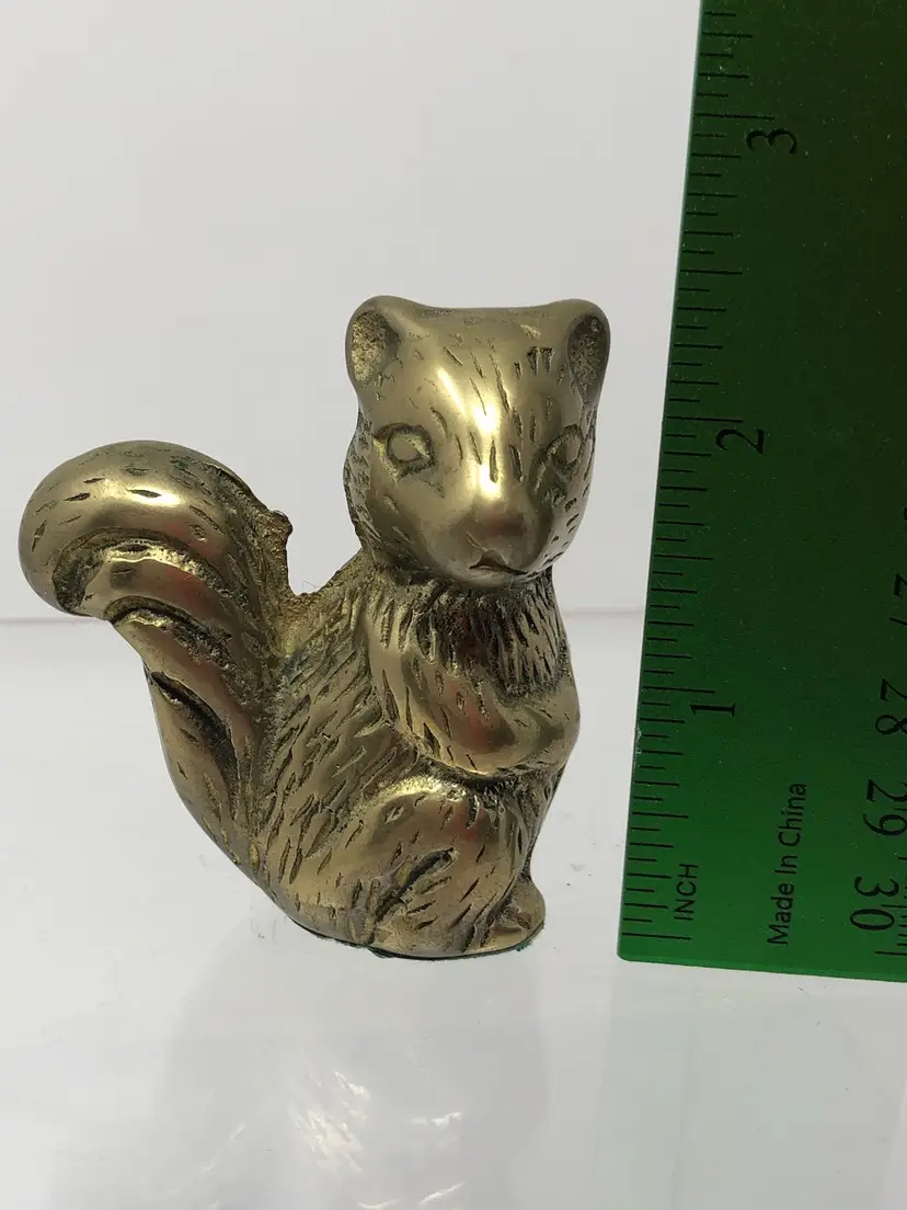 2 1/4" brass squirrel with felted bottom and remnants of original label. Excellent condition.