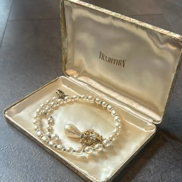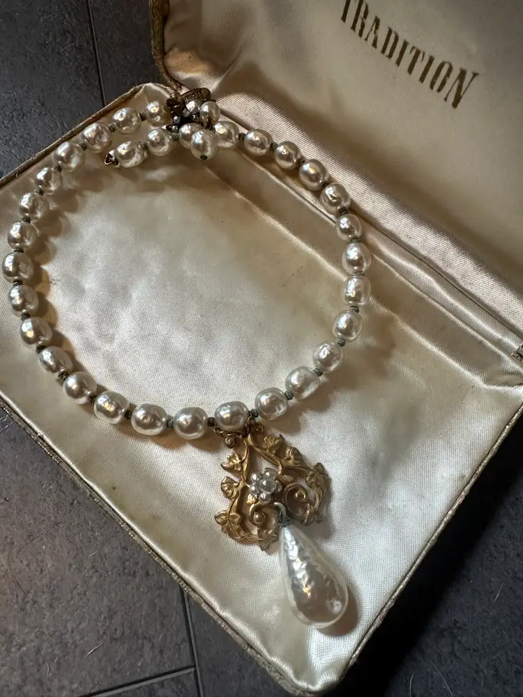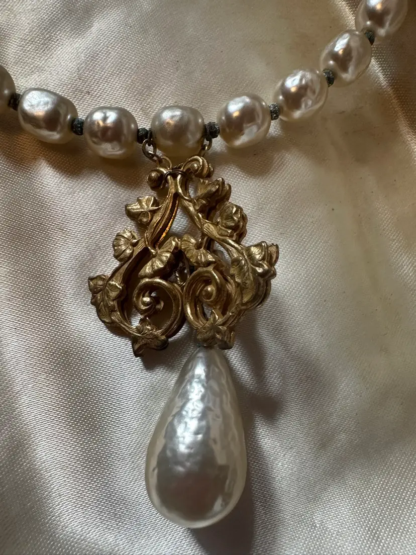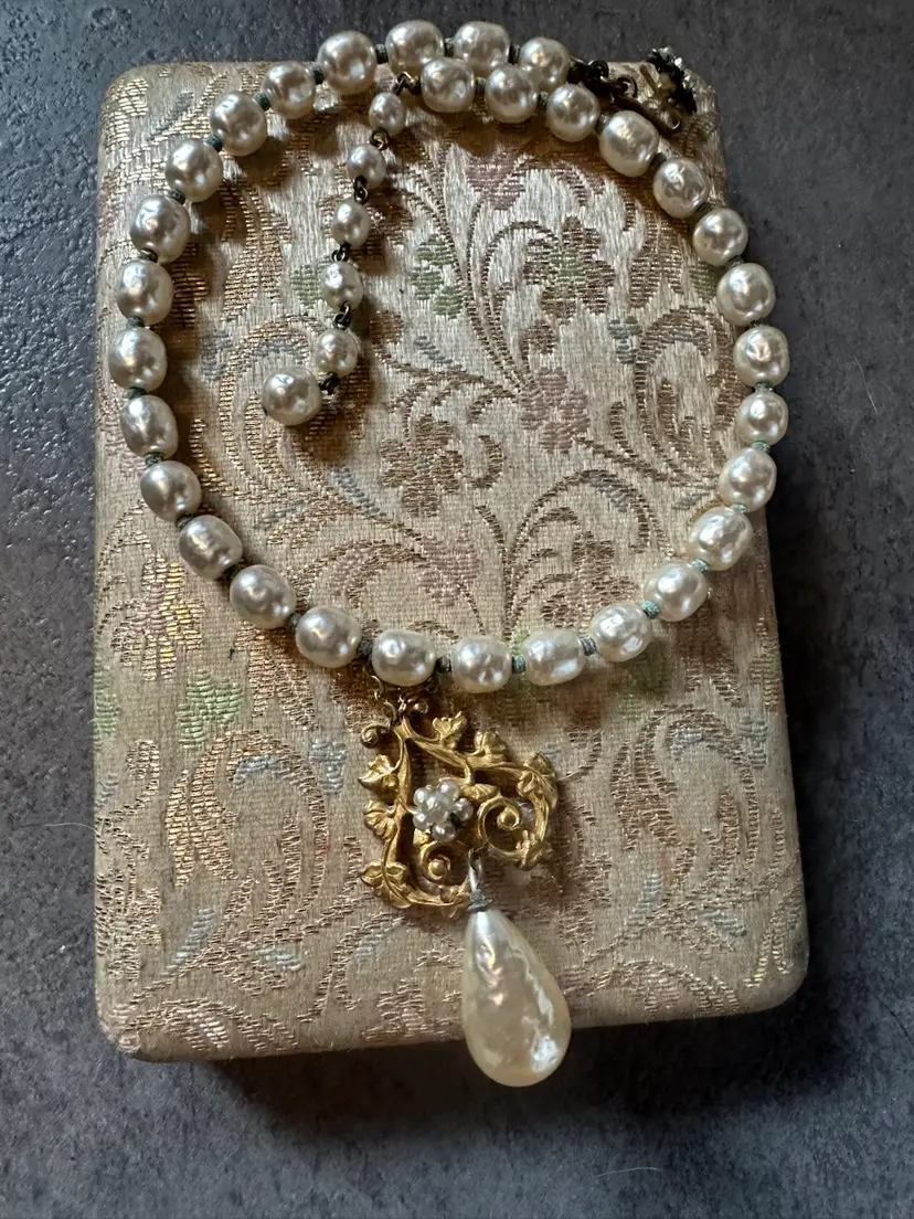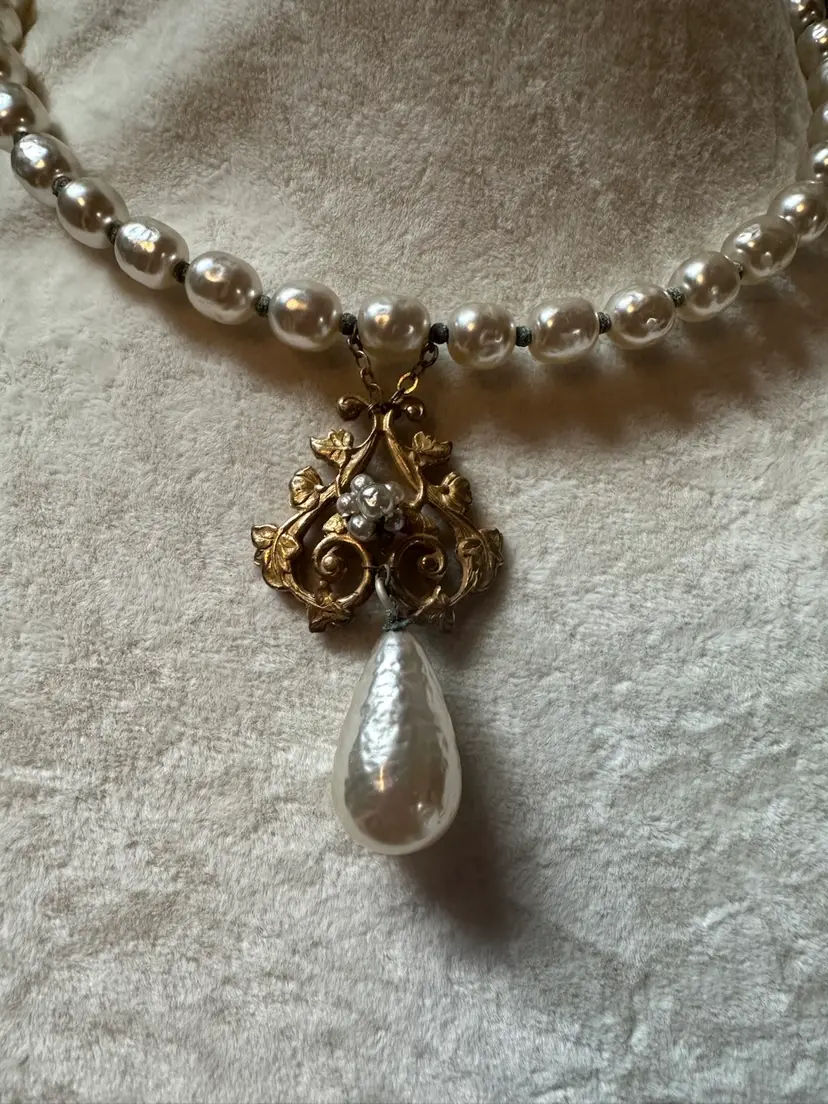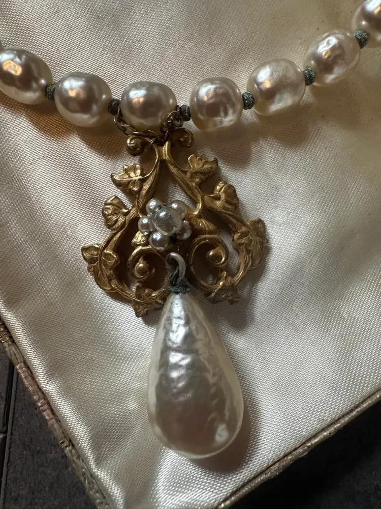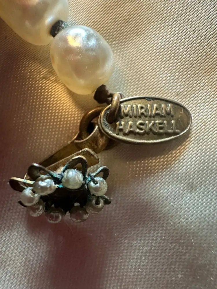 Stunning pearl choker by the acclaimed designer, Miriam Haskell. Definitely shows its age with vertigree present. Also missing center pearl of back clasp which is not significantly noticeable. Gorgeous box it was purchased in comes with. Priced considering all these factors.