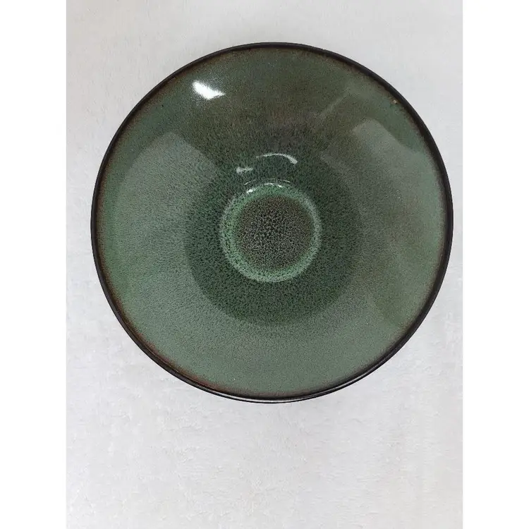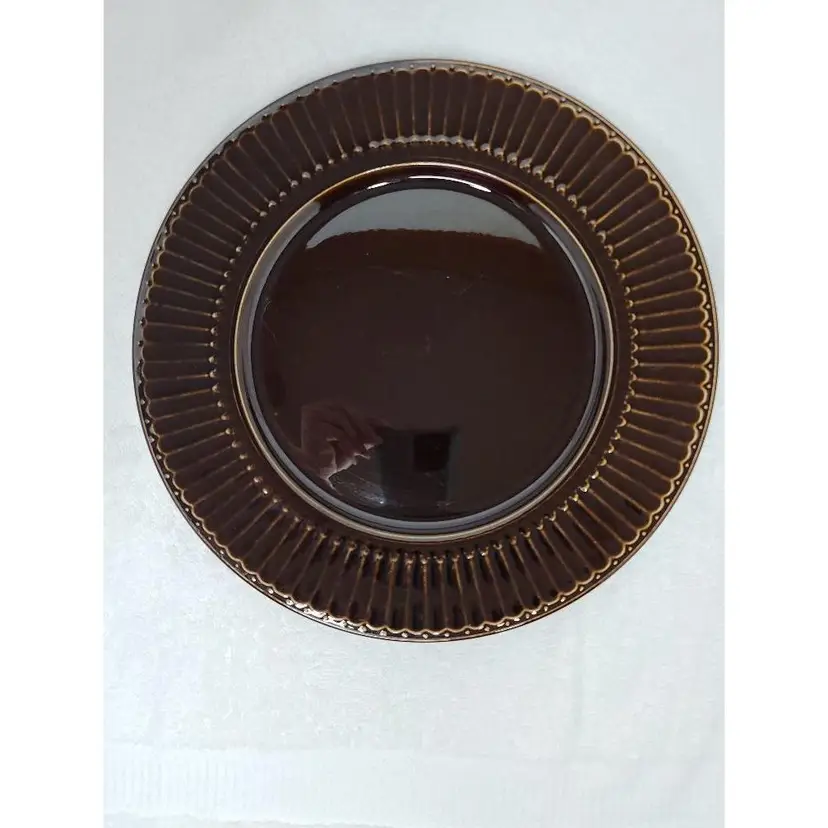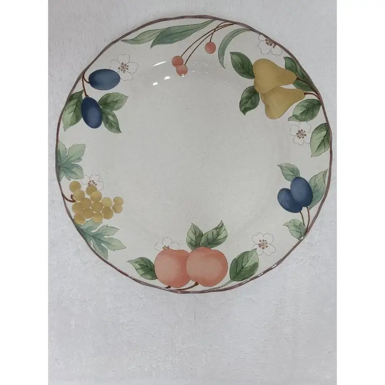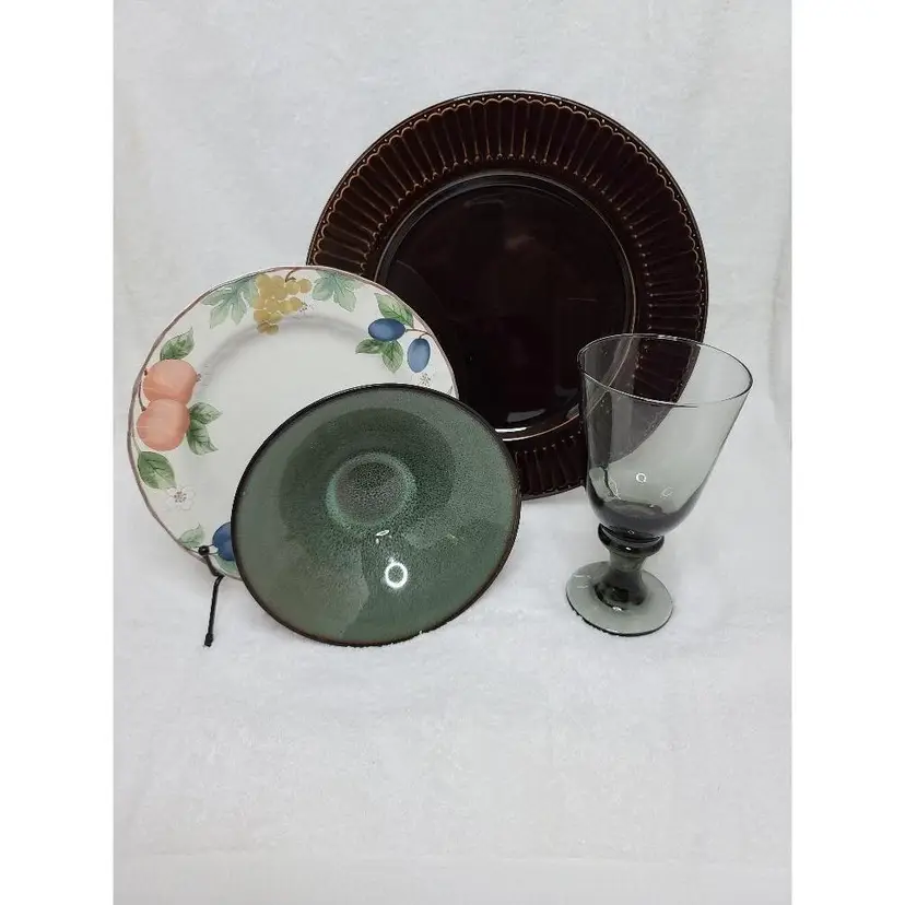 This 4 piece place setting has elegant garden vibe. Each piece has a design different yet complimentary to the next. The dinner plate has texture with a deep coffee brown, shiny glaze. The salad plate has a border of fruit. The bowl Asian style design with a speckled blue green interior and a dark matte outer. The beverage glass is a classic pedestal.