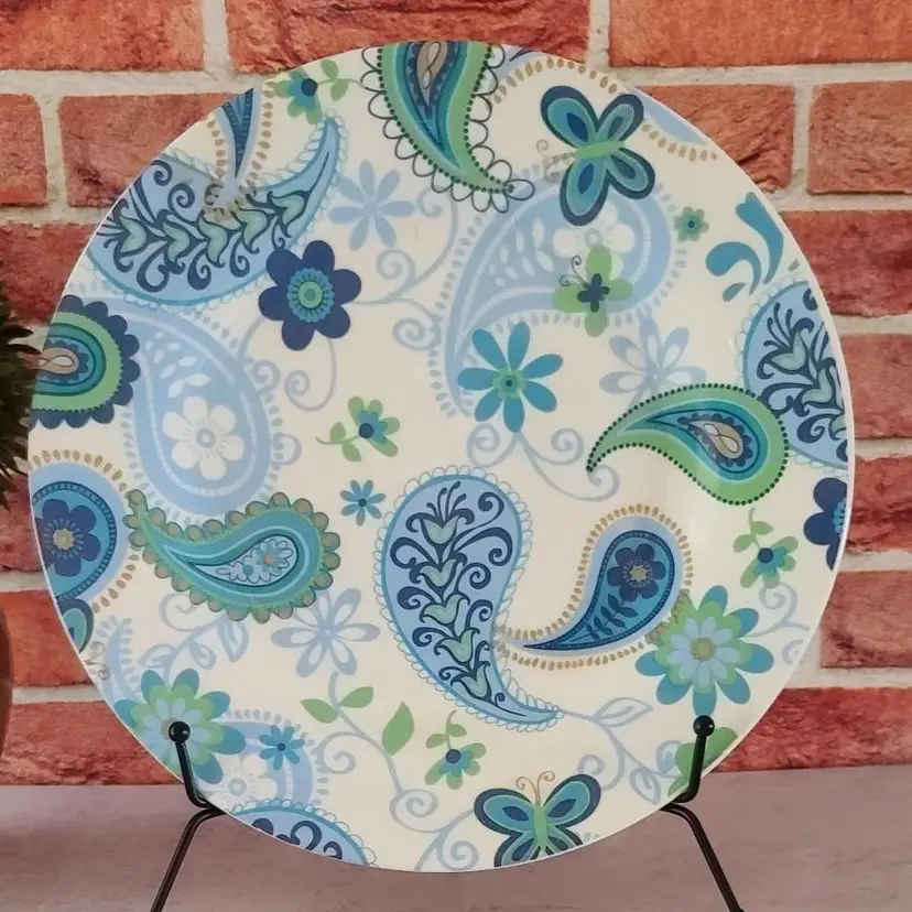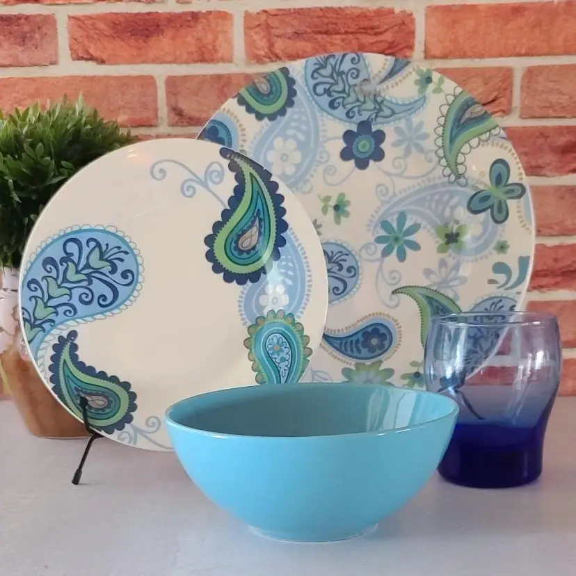 This 4 piece place setting Whimsical vibe full of movement. Each piece has a design different and complimentary to the next. The dinner plate is Royal Norfolk “Blue Paisley” with great oceanic colors and movement. The salad plate is Royal Norfolk with colors shapes similar or same as the dinner plate. The bowl is Ikea is basics blue that compliments and does not compete with the plates.. The beverage glass is a deep cobalt base that fades upward to translucent pale blue. MIX-030-004