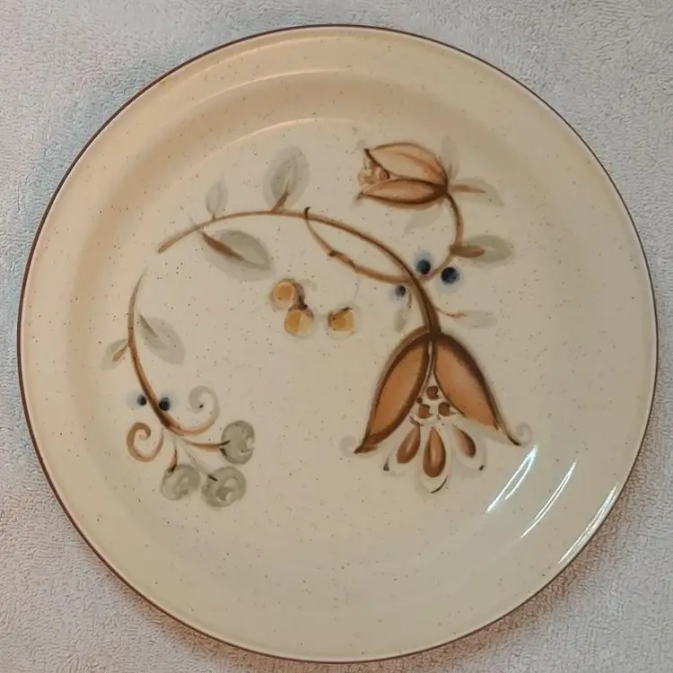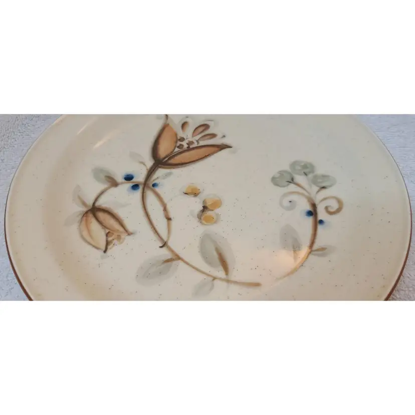 This 4 piece place setting Mid Century Danish feel. Each piece has a design different and complimentary to the next. The dinner plate is Ikea Rust, basic shiney classic dinner plate.. The salad plate has Danish flair with Nortake “River Fall” pattern with brown tulips , grey buds and cobalt berries. The bowl, Threshold “WellsBridge” pulls the grey from the salad plate. The beverage glass is classic cobalt semi-stem which compliments without distracting from the setting. mix-050-004