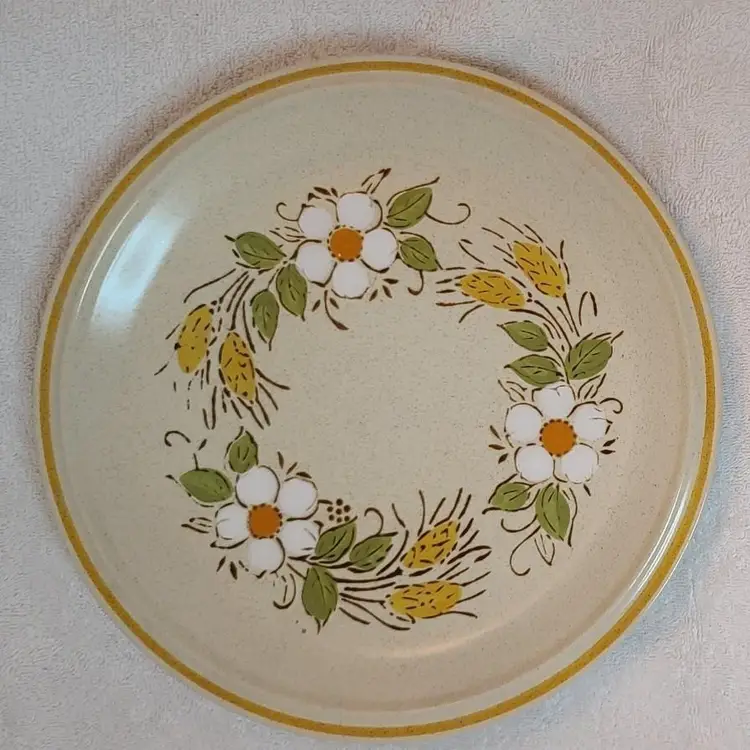 This 4 piece place setting Traditional 1970s color palate and feel. Each piece has a design different and complimentary to the next. The dinner plate is Hearthside “Prairie Flowers” with White flowers with a bright orange center, green leaves and golden stalks of wheat. The salad plate Norfolk in muted pumpkin orange is a great compliment to the flower on the dinner plate. Norfolk orange bowl picks up the center color of the flower on the dinner plate. The beverage glass is a “Pioneer Woman” prairie feel which compliments without distracting from the setting. MIX-045-004
