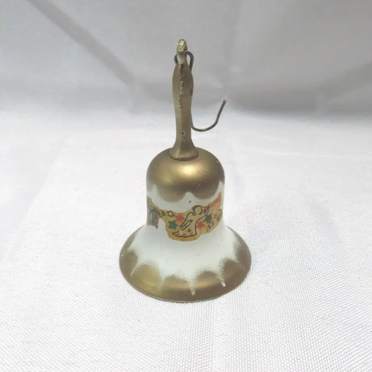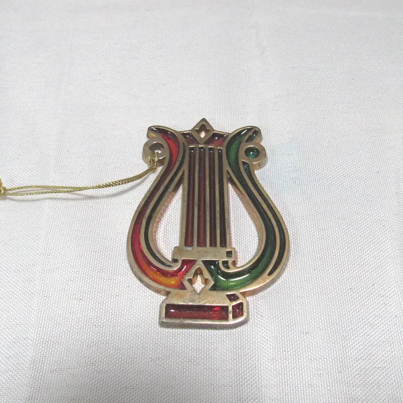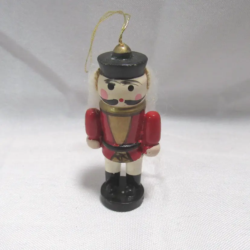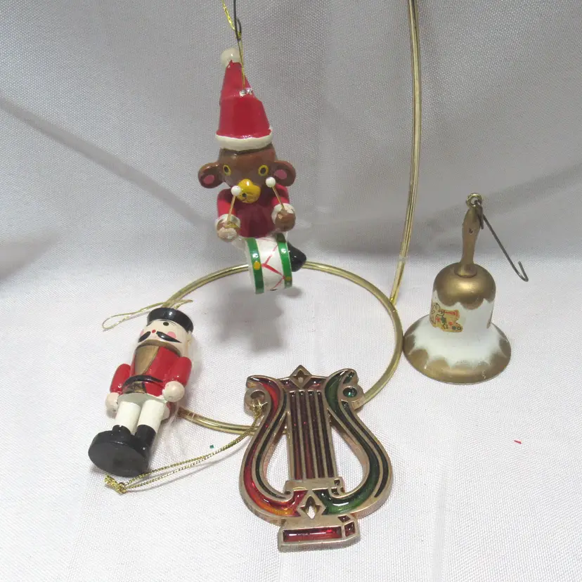 All are in good used condition w/ no boxes Wooden Bear Drummer 3" long Wooden Nutcracker 2.5" long Avon Faux Stained Glass harp 2 7/8" long Metal Bell 2.75" long