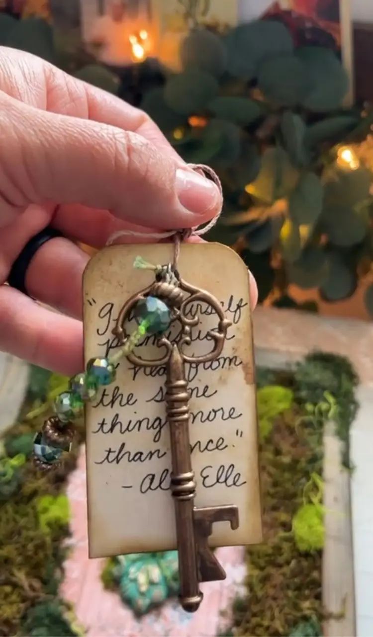 I started with a thrifted frame (this is NOT new, not a perfect frame), kept the mat intact and added a design of wallpaper and my own handwriting printed on 67lb paper, attached a lock (I think it's ceramic) and started gluing moss to the frame. I had the key and thought it would be perfect for this piece so I brushed on some copper/metallic paint on the lock and the key to bring them together, added the string of beads and handwrote this:
