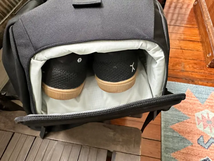 • shoe compartment! very clever and practical feature, includes air holes for ventilation (shown) expandable - when I did need to haul more stuff than usual, the adjustable strap lets the top expand to accommodate a lot more