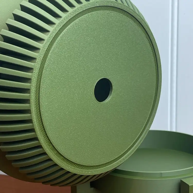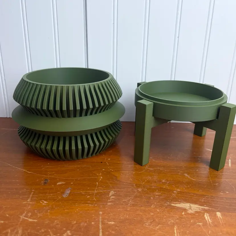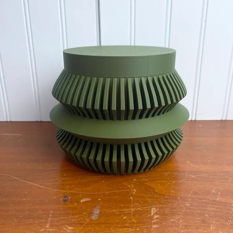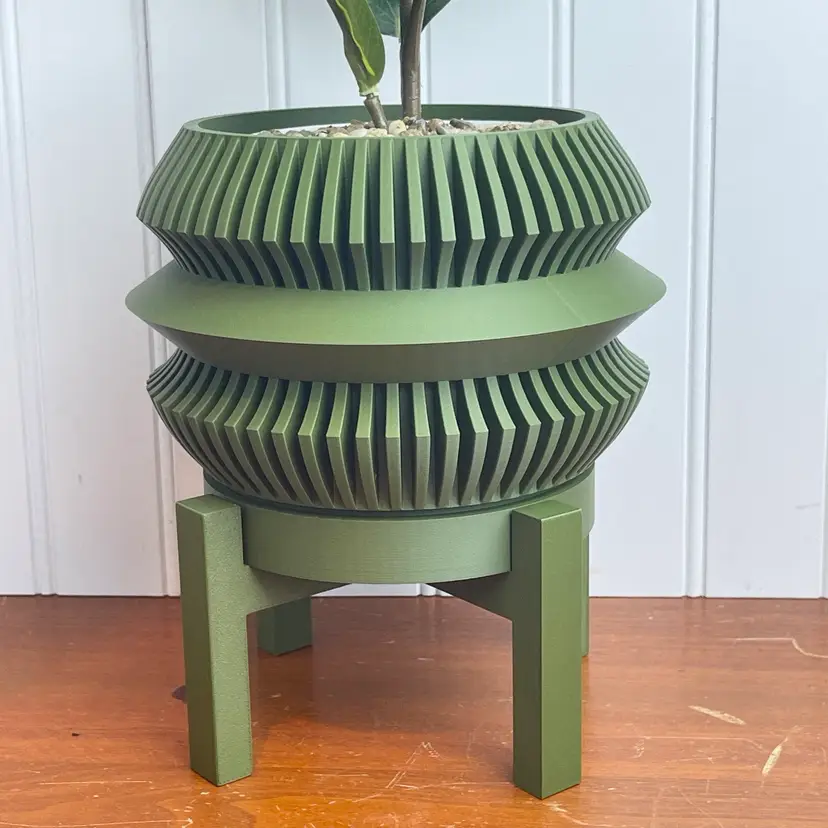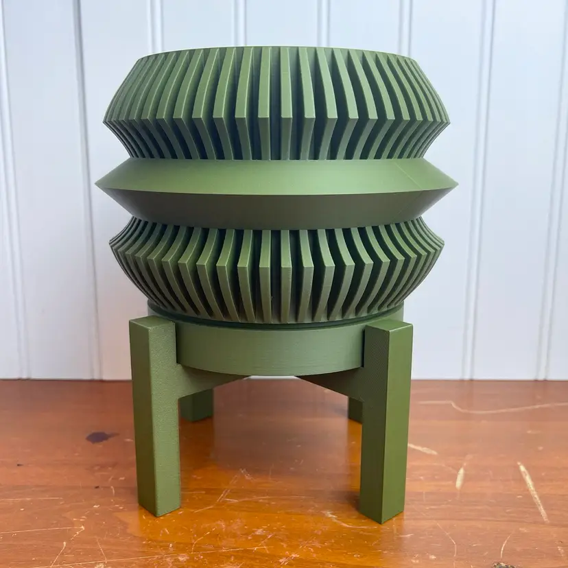 The planter is 3D printed using eco-friendly, biodegradable PLA plastic filament. 3D printing is done by printing layer upon layer of filament to build up and create the print.