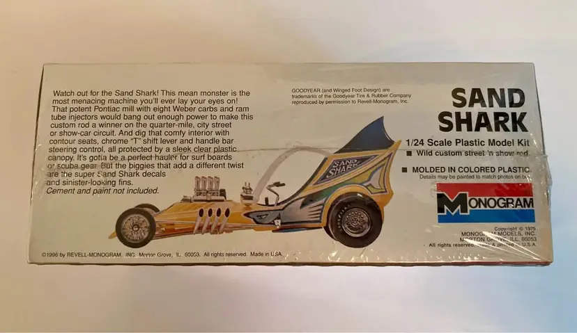 New and Sealed 1996 Monogram Sand Shark Model Car Kit Made and Printed in USA 1:24 Scale Molded in Colored Plastic This item ships from Toronto, CA within 3 business days and shipping time is 5-10 business days. This item ships with any other item for $5.