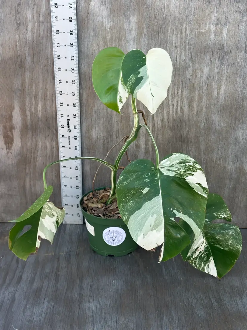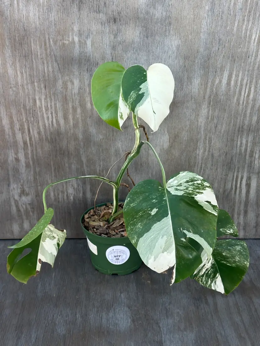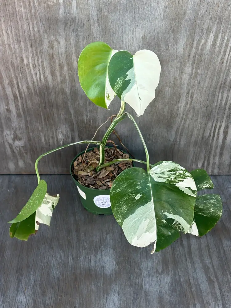 Monstera borsigiana 'Albo', growing in a 6-inch pot.