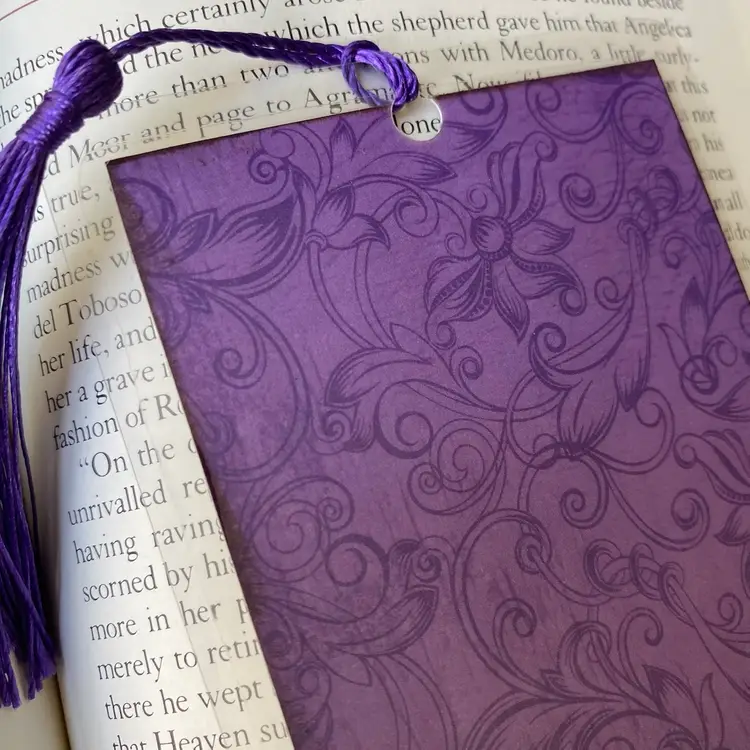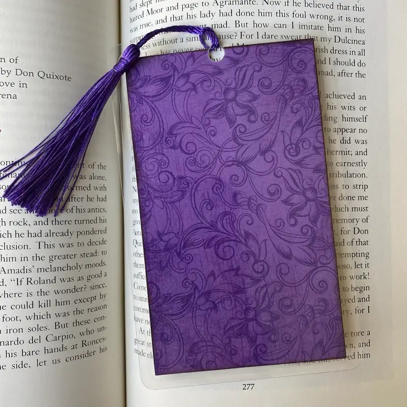 Handmade from old library check out cards! Cat and pumpkin stamp with moon sticker. Happy Halloween imprinted on the front. Purple design on back and purple tassel. Laminated with 5MIL.