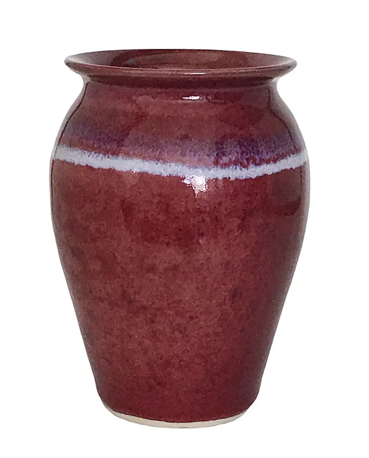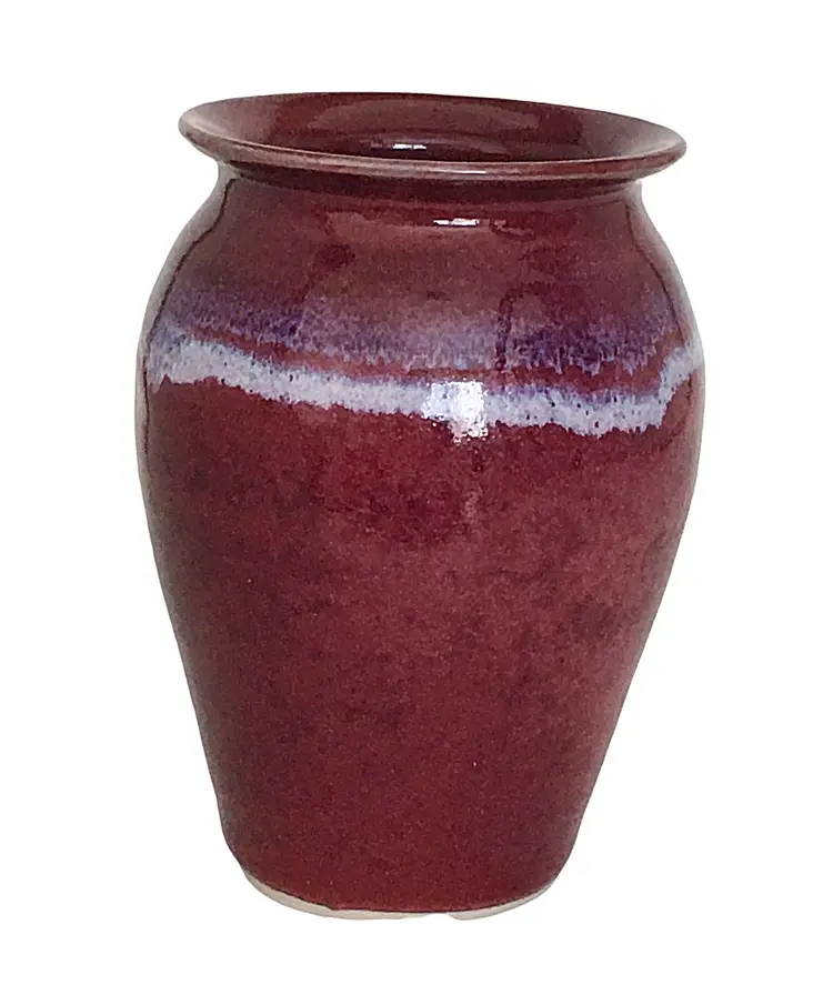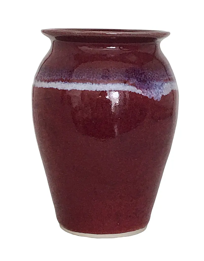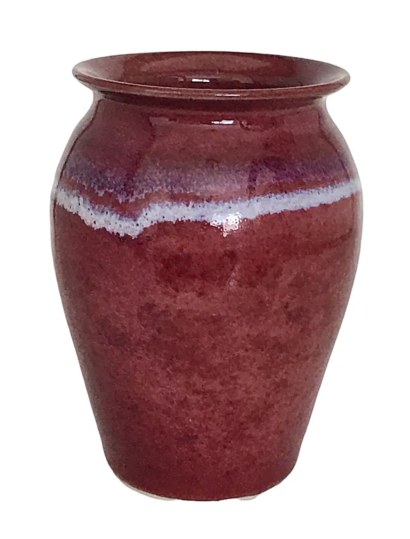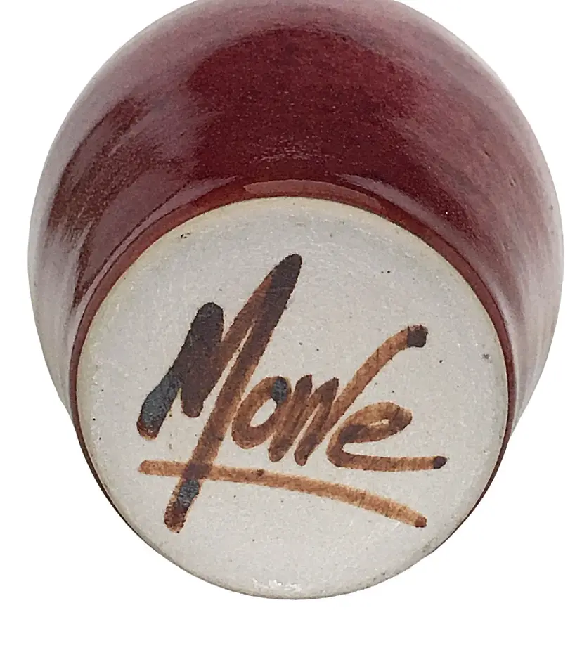 Production Technique: Pottery Country/Region of Manufacture: Unknown Item Height: 5 1/4" Item Width: 4" Product Line: Mowe Material: Clay Type: Vase Features: Purple Accents Color: Burgundy Finish: Glossy Item Length: 4" Signed: Yes Signed By: Mowe Item Weight: 1 lb 2 oz Brand: Mowe Production Style: Art Pottery Original/Licensed Reproduction: Original