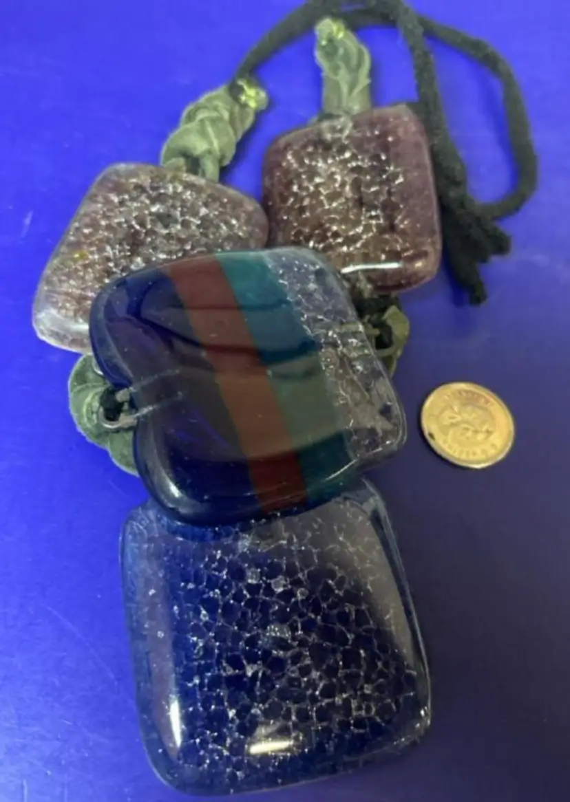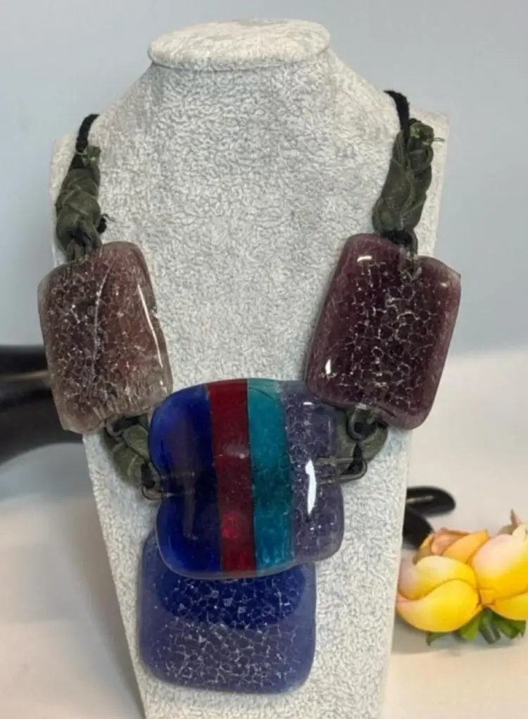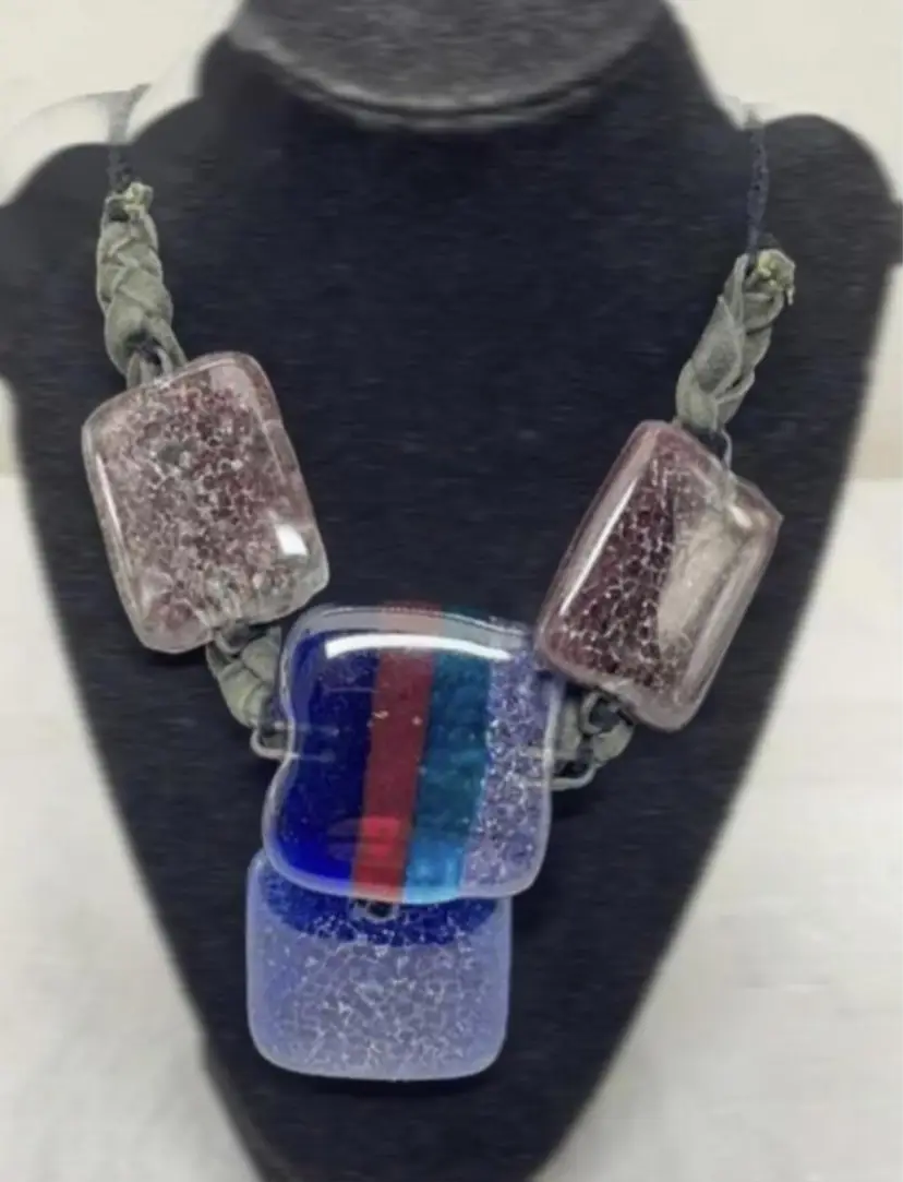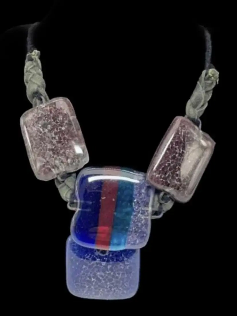Multi Colour Fused Dichroic Art Glass Statement Necklace 18’’ able to go longer 4 Glass Squares 1.75 - 2’’ Artisan Made