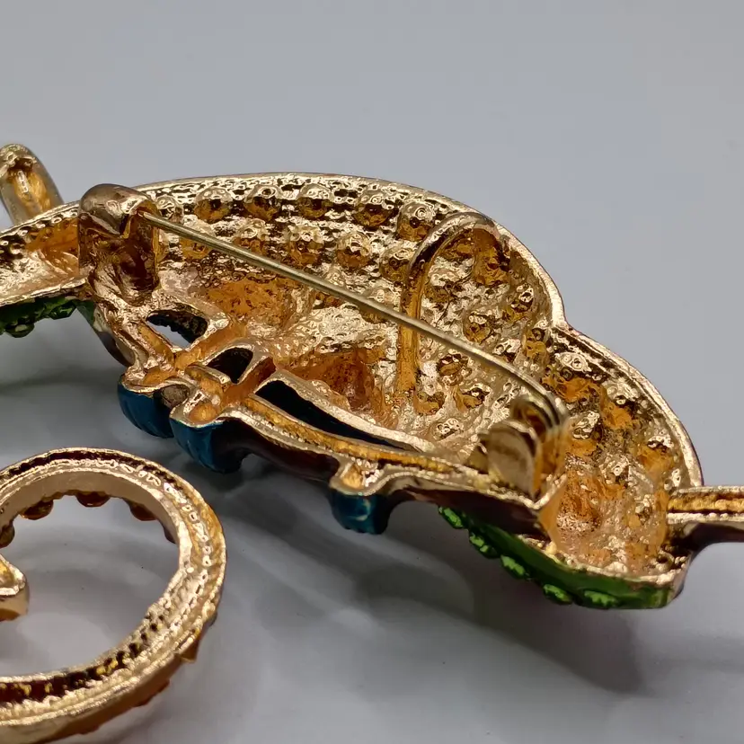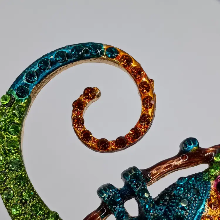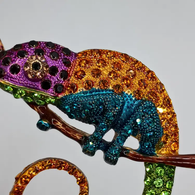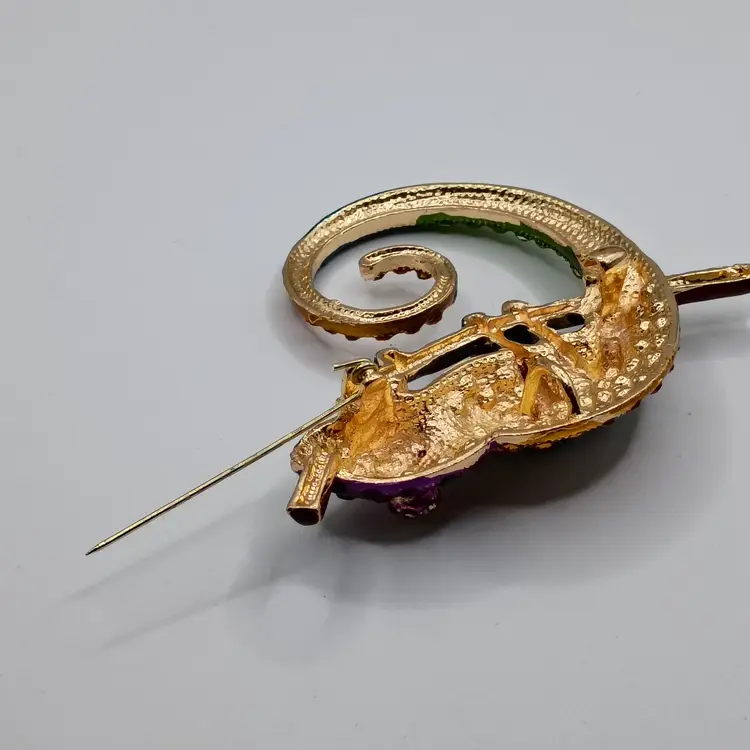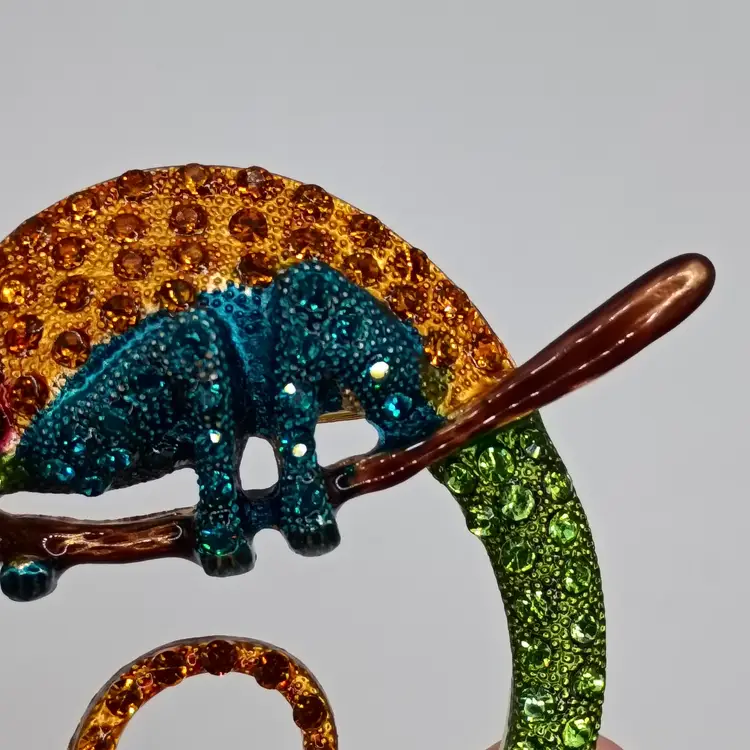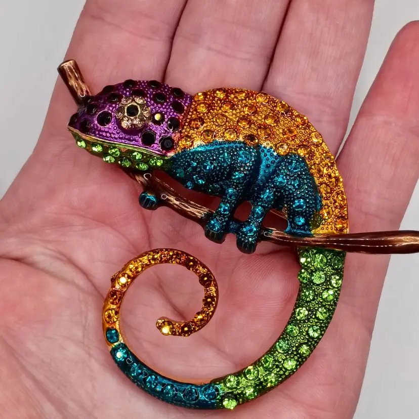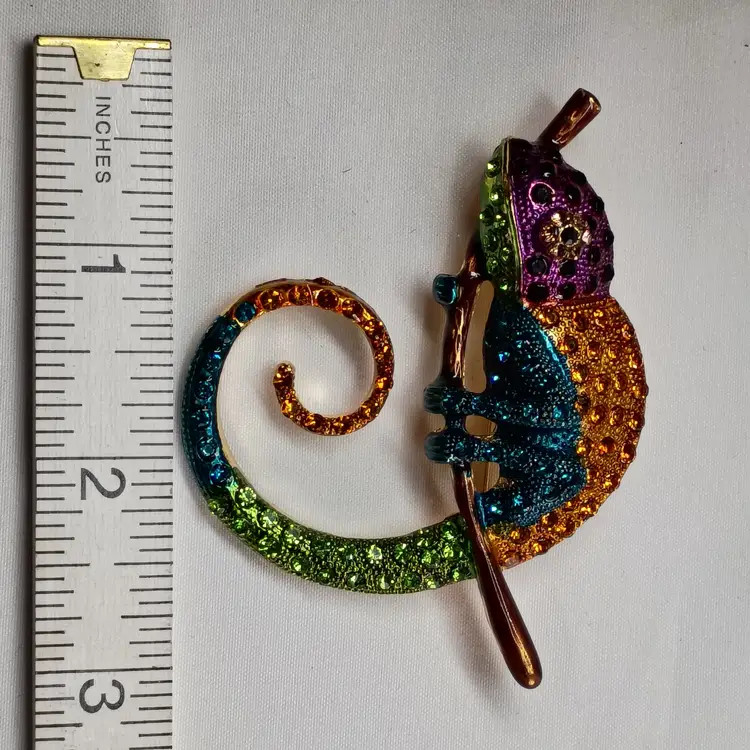 Gorgeous multicolor chameleon brooch pendant loaded with vibrant sparkling rhinestones and a whimsical curled tail design. Perched on a branch with both a pin back and a bail so it can be worn as either a brooch or a pendant. Safety clasp works properly. A bold and eye-catching statement piece full of personality and shine. Please see pictures for measurements. Excellent condition with no missing stones noticed.