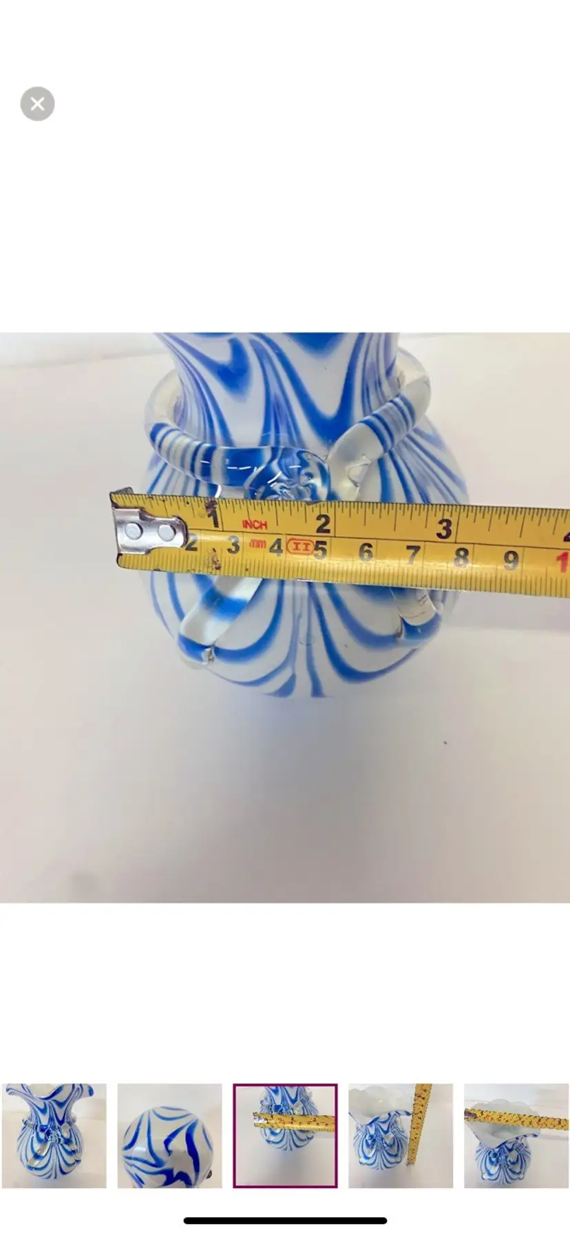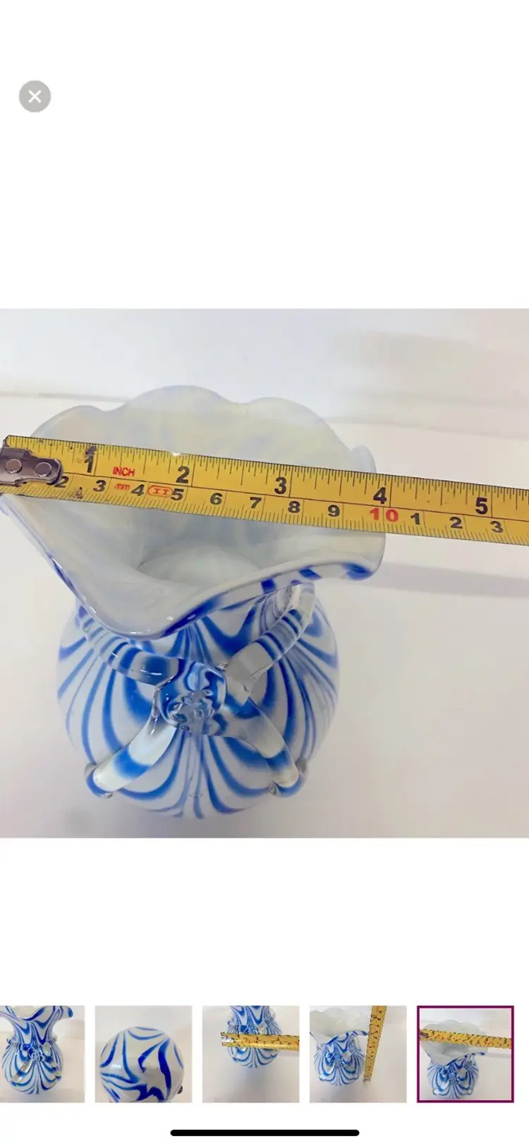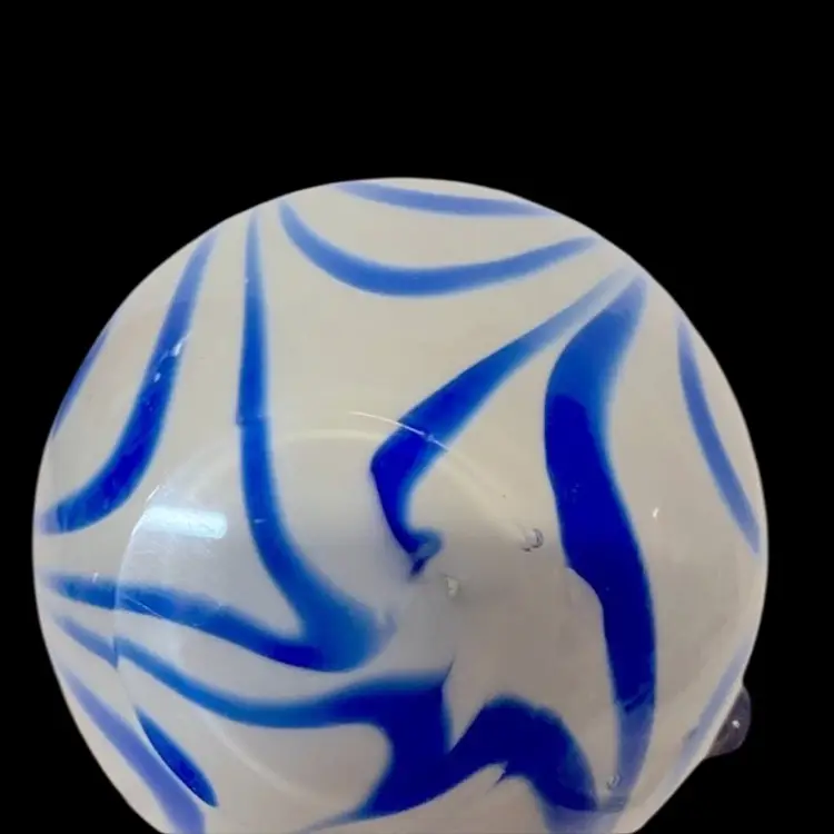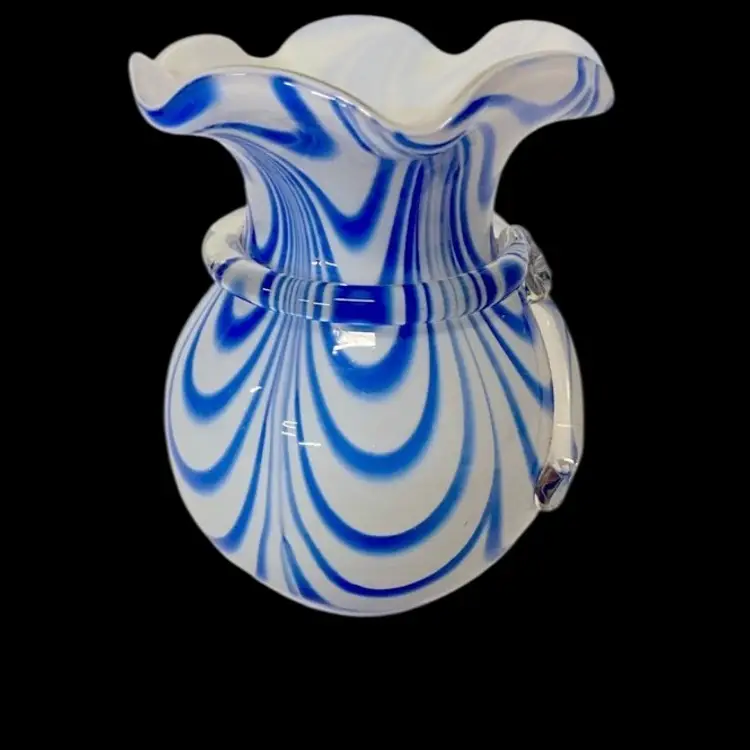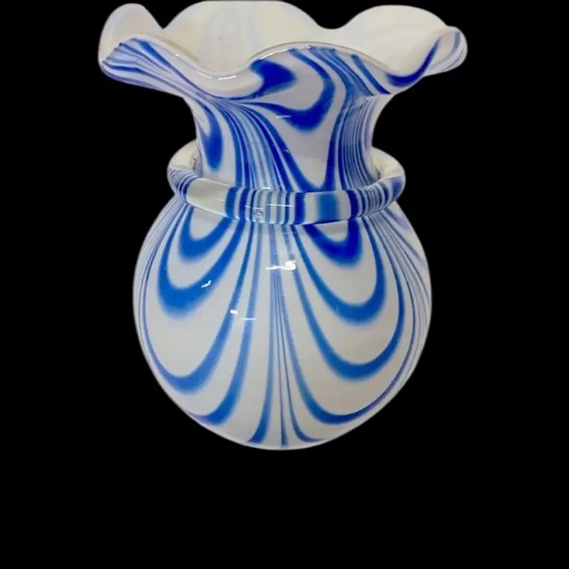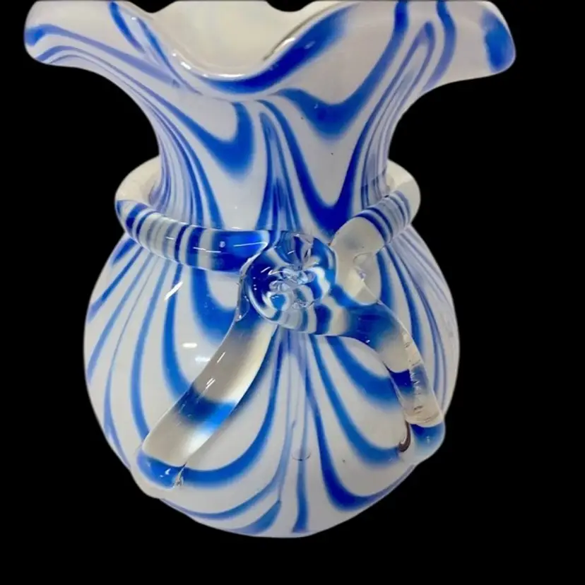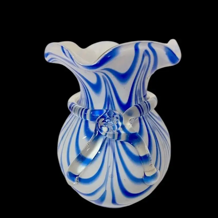Murano Art Glass Vase , Blue & White Swirl Rim Vase, Ruffled Edge, With Clear Glass Bow Around Vase. Vintage