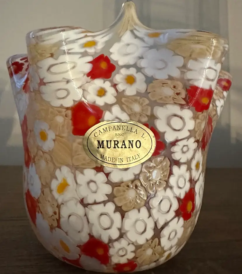 NEW PRICE!! This beautiful mini vase is a genuine piece of Murano glassware, crafted in Venice using the millefiori technique. The quilted pattern and multicolor design make it a perfect decorative item for any home, adding a touch of color and elegance to any room. Measuring at 3 1/2 inches in height and 3 inches in width, it is the perfect size for displaying small flower arrangements or as a standalone piece.