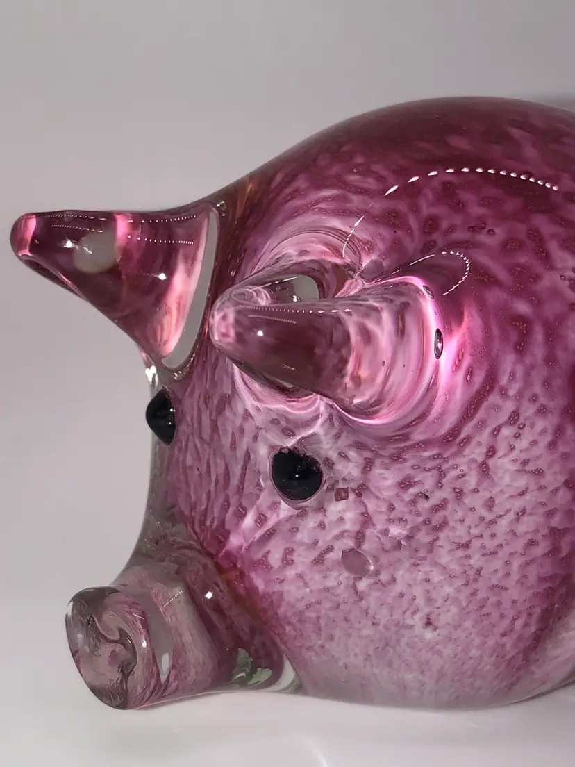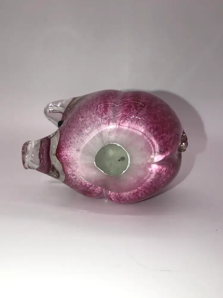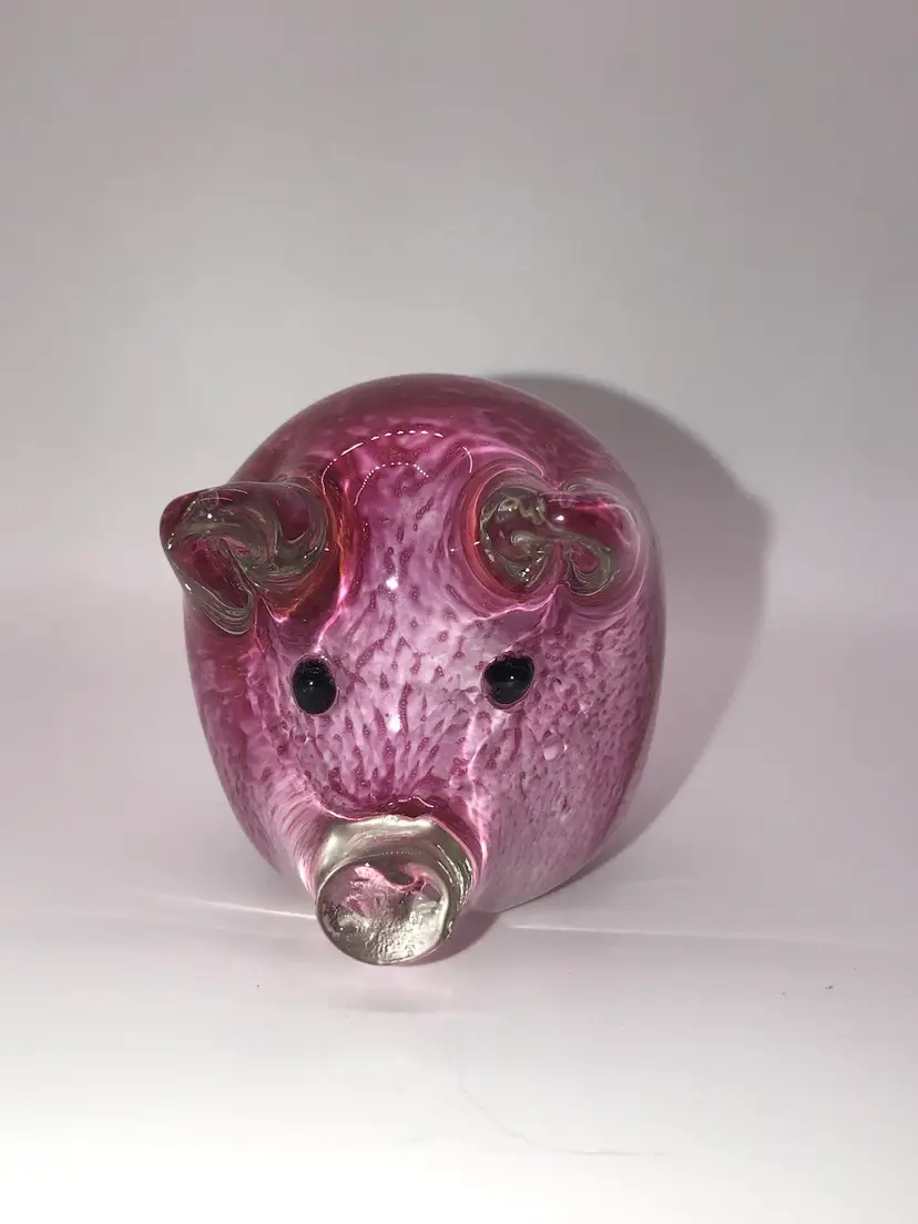 The Murano Glass Style Pig Paperweight in pink swirl glass is a hand-blown art glass piece that features a glossy finish. This decorative paperweight is handmade by skilled artisans using traditional techniques, making it an original and unique addition to any collection. The pig theme adds a playful touch to the piece, making it a charming and stylish decor item for any space.