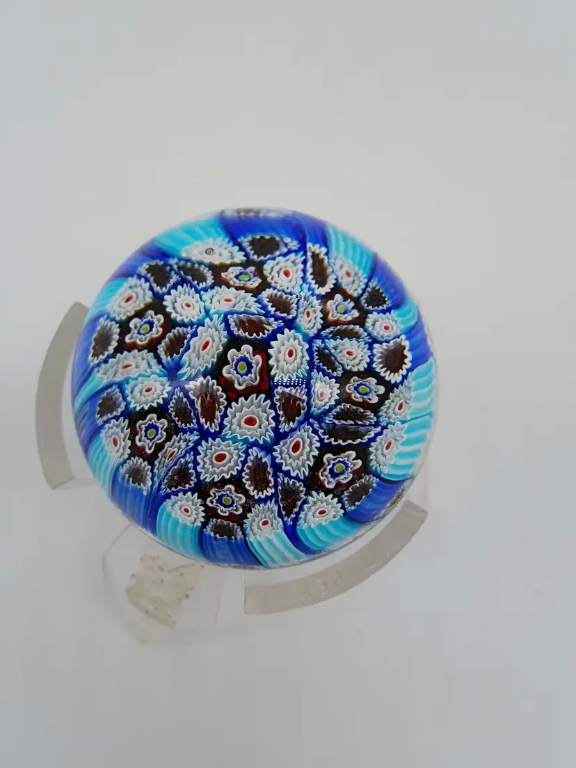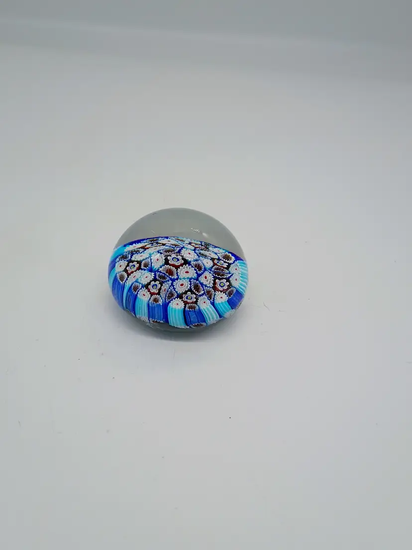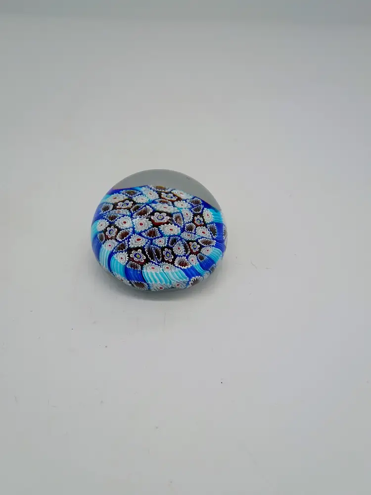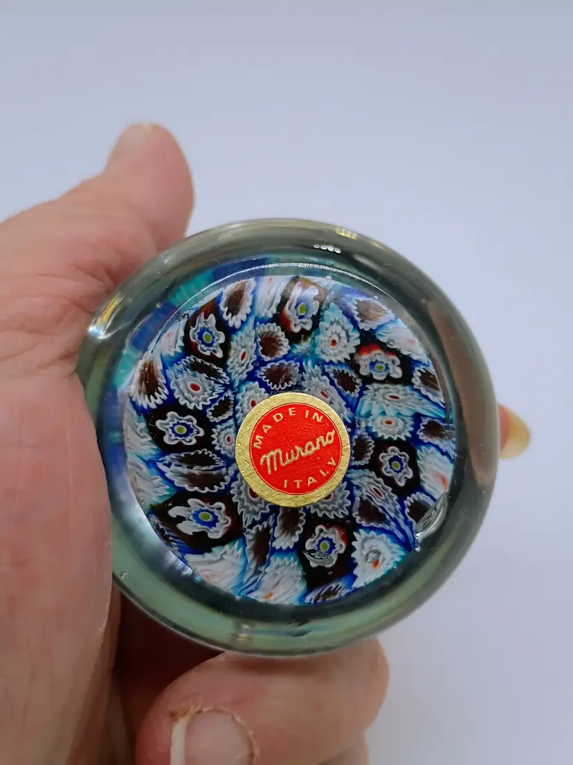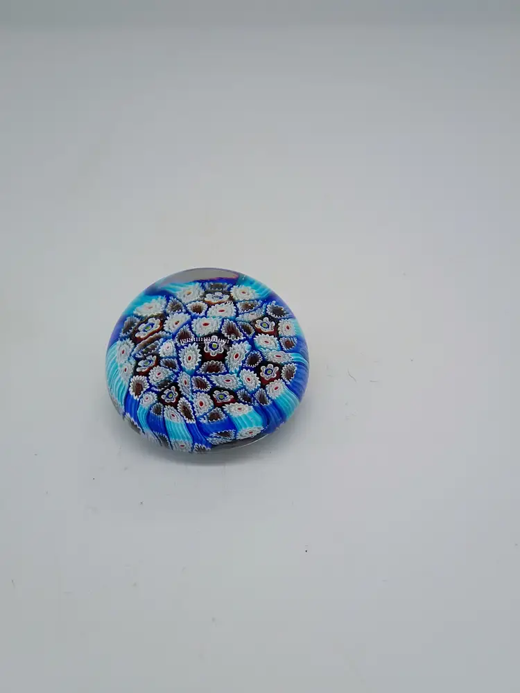 Murano Millefiori Paperweight Blue Red & White Flower Canes with Label . This is 2 inches in diameter and 1.75 inches tall. Smooth flat clear round polished base . Unsigned unless it's under the sticker. This is preowned, No chips cracks or flea bites, No fractures or bruises. Has original foil label. Near Mint condition. Ships USPS domestically and UPS or USPS International Shipping globally